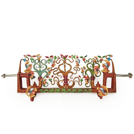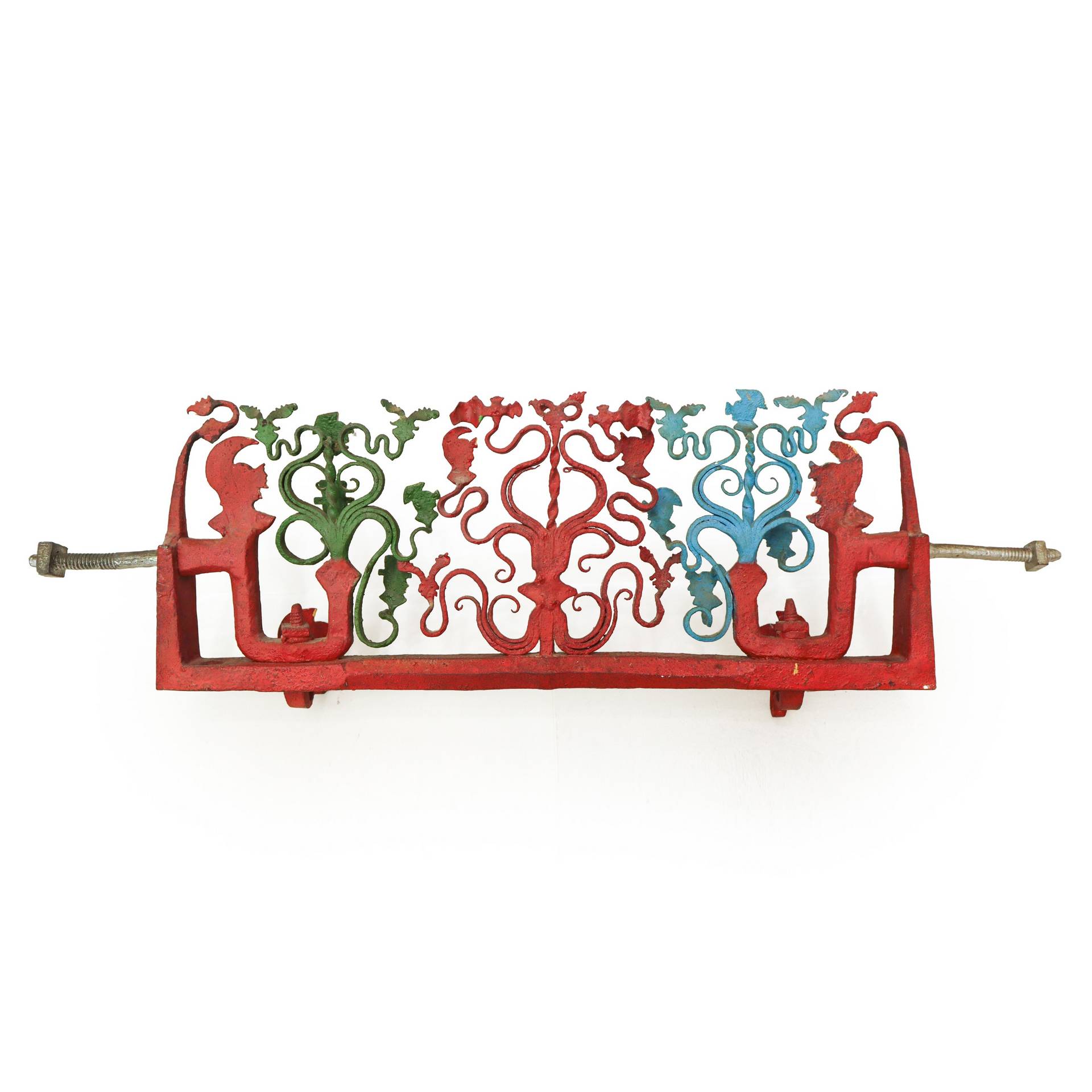 Frammento di carretto in ferro battuto con raffigurazioni di teste dei paladini di Francia. cm 60x23