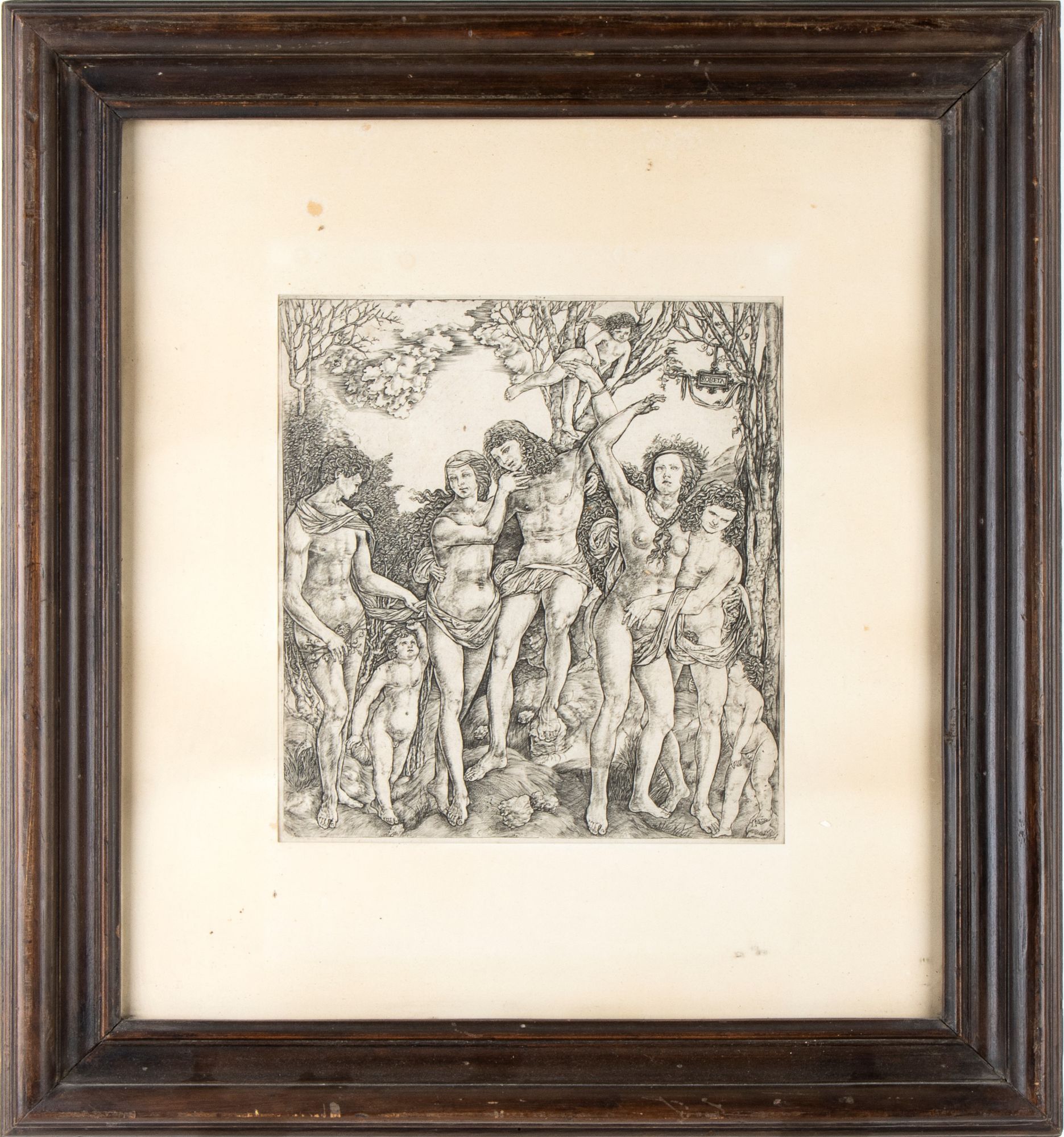 bulino, 300 x 280 mm (lastra); 395 x 290 mm (foglio). Nitida impressione con toni neri profondi, su carta vergata spessa con filigrana (tulipano con due foglie?), edizione Vallardi?. Esemplare con grandi margini in alto e in basso, e con i margini di circa 5 mm su lato destro e sinistro. Ottimo stato di conservazione salvo un piccolo graffio sul petto e sul braccio dell'uomo rappresentato al estrema sinistra. Incollato in due punti su passe-partout. Carta leggermente brunita.