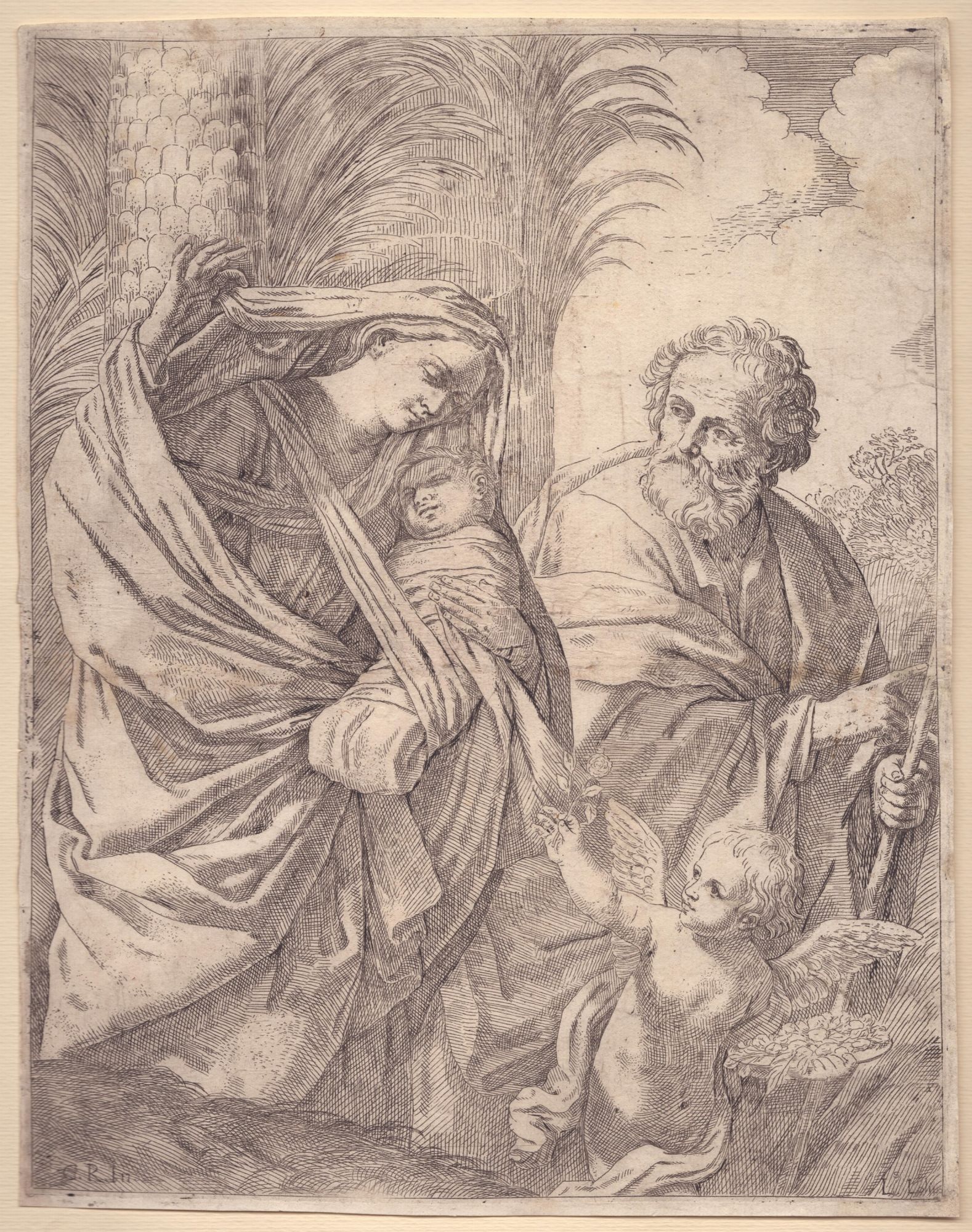 da Guido Reni. Acquaforte, 317 x 247 mm. Bartsch XIX.165.1. Bellissima impressione su carta vergata con filigrana. Esemplare rifilato ma con piccoli margini. Foglio incollato in tre punti lungo il margine sinistro su un passe-partout. Per il resto in ottimo stato.
