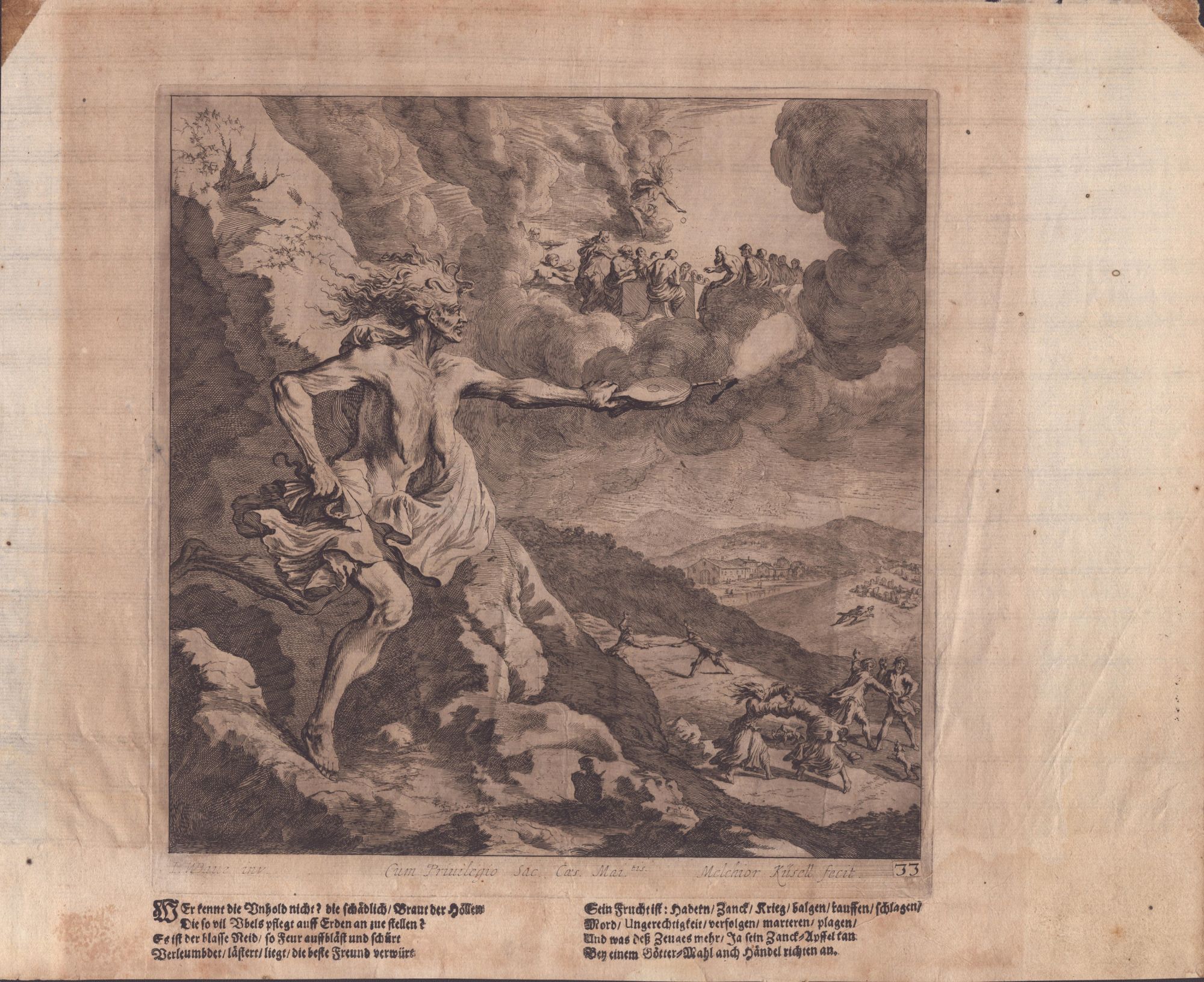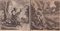 acquaforte, 237 x 228 mm (lastra); 290 x 355 mm (foglio). Da una serie non identificata. Belle impressioni su carta vergata sottile con filigrana (letter SW sopra una croce). Sui margini inferiori, fuori della battuta della lastra, lunghe iscrizioni i in tedesco. Piccoli ritagli con i numeri "32" e "33" negli angoli in basso a destra della lastra. Fogli in buono stato, con la parta inferiore rinforzata e degli angoli mancanti restaurati. Alcune sgualciature e ossidazioni. Su uno dei fogli scritta autografa ad inchiostro blu.
