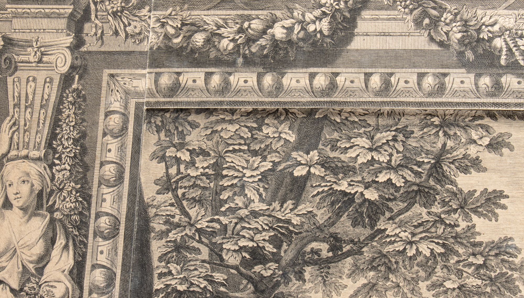 bulino e acquaforte, 66,5 x 118,5 cm ca. (totale). Stampata da 5 lastre (la parte centrale e 4 parti della grade bordura ornamentale). Esemplare intelato. La parte centrale in ottimo stato, la parte di bordura con delle usure lungo i margini (qualche breve strappo, ossidazioni e macchie).