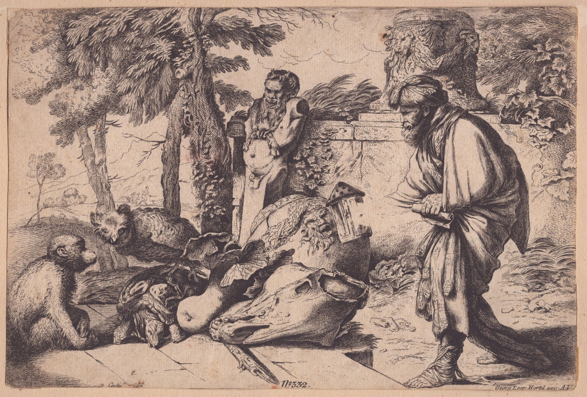 da Giovanni Benedetto Castiglione. Acquaforte, 197 x 293 mm. Bella impressione su carta vergata con filigrana. Esemplare rifilato, senza i margini. Incollato nel angolo superiore sinistro sul supporto moderno.