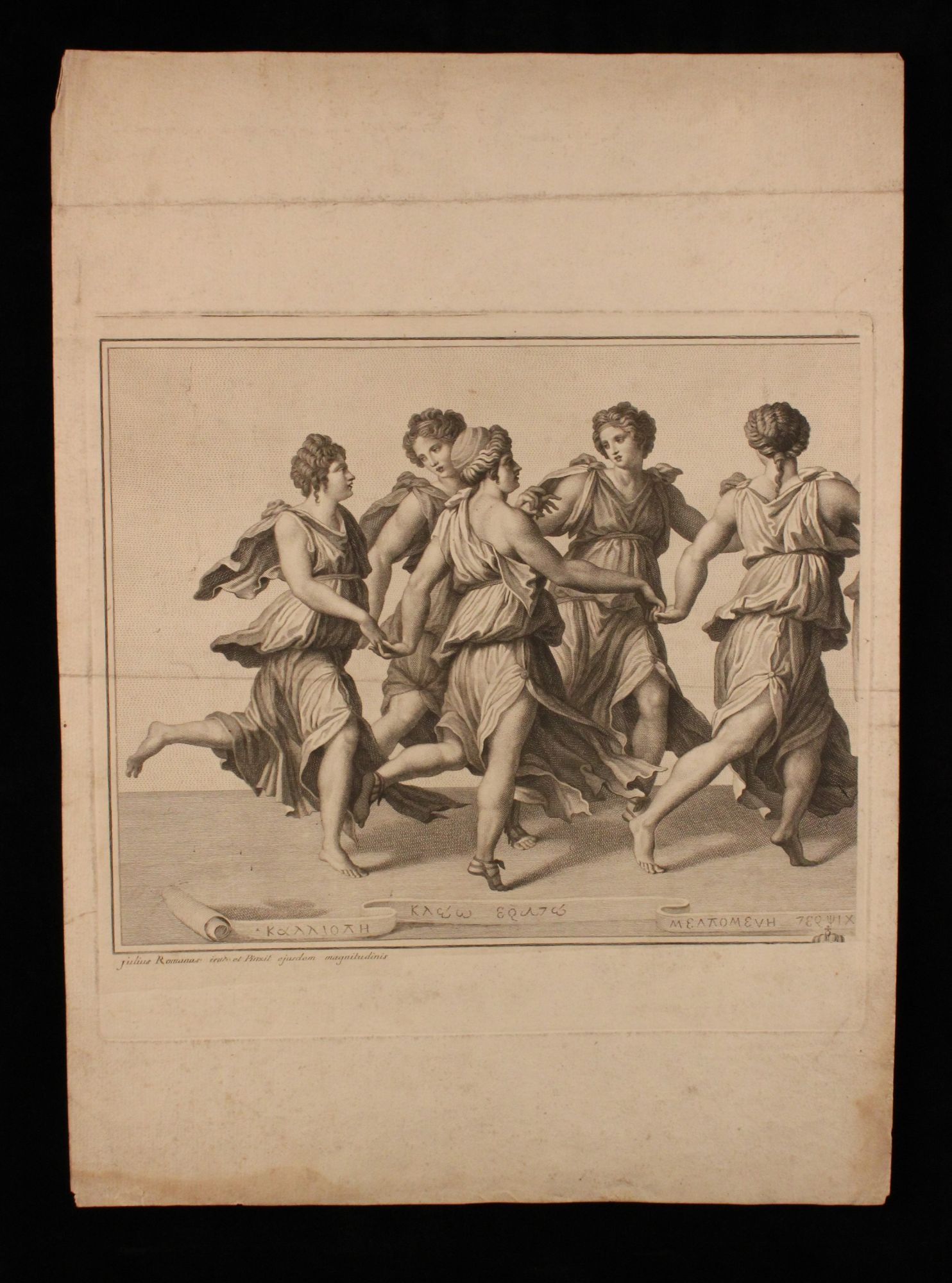 Acquaforte, cm 42,7x59. La grande incisione era composta da due fogli distinti, con Apollo e le Muse che danzano in cerchio tenendosi per mano, dal soggetto di Giulio Romano nella Galleria Palatina di Palazzo Pitti a Firenze; questa è la parte sinistra che inquadra 5 delle 9 Muse danzanti. Esemplare stampato su carta vergata, su foglio integro e completo di grandi margini. Stato di conservazione ottimo.