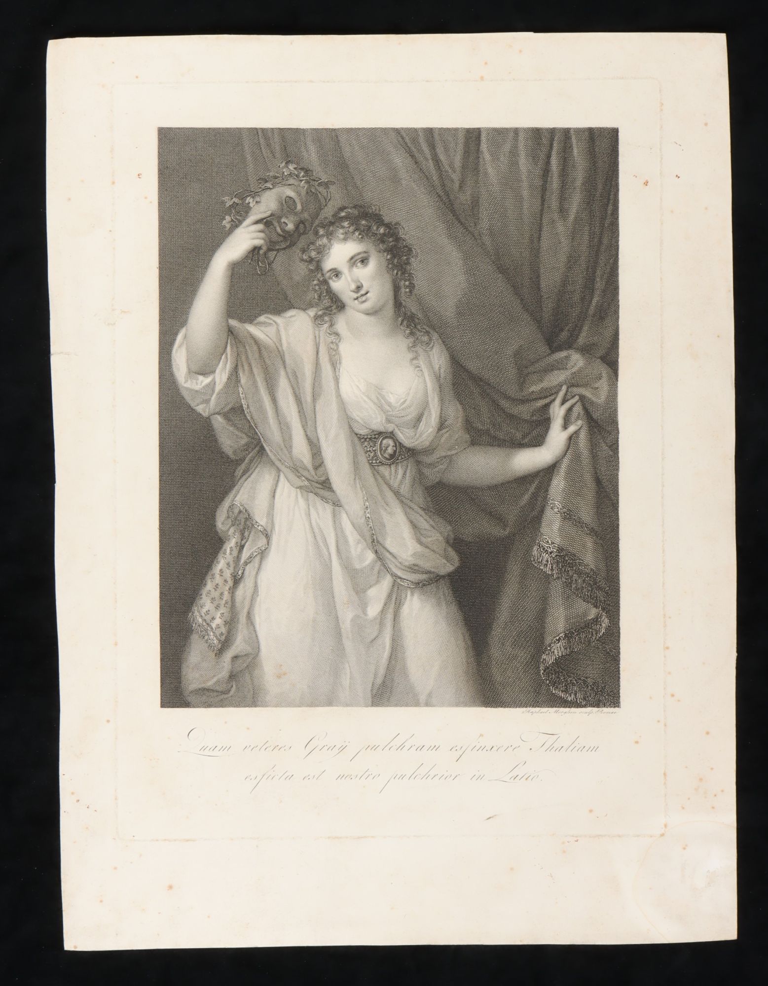 dal dipinto di Angelika Kauffmann (1741-1807). Acquaforte, cm 39,7x52,8. L’incisione è in realtà il ritratto di Emma Hartt (1761-1815), poi Lady Hamilton nei panni di Thalia, la Musa della commedia greca. Esemplare con foglio completo ed integro, con un piccolo strappo al margine sinistro; e un lievissimo foxing. In generale ottimo stato di conservazione.