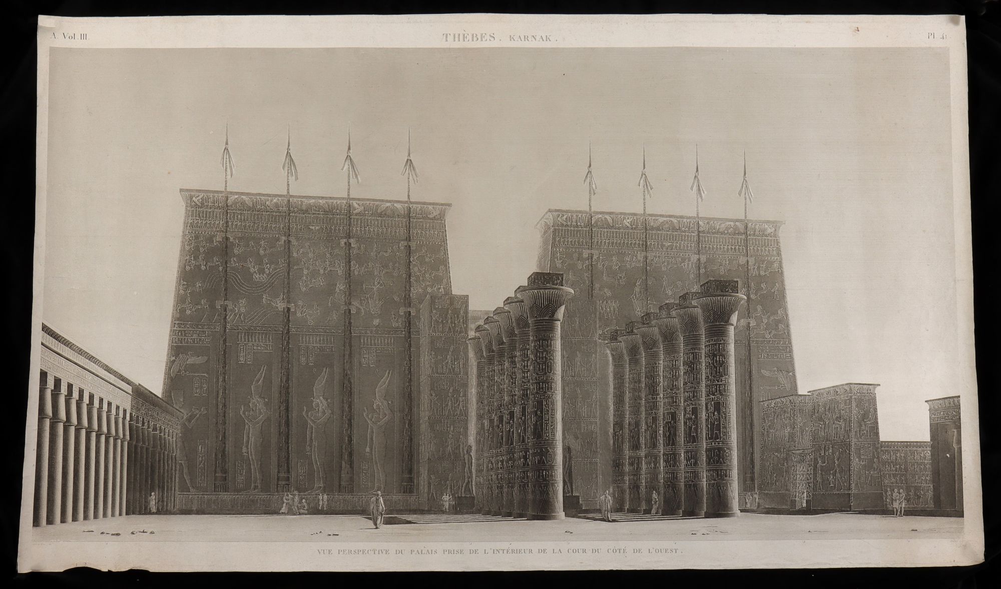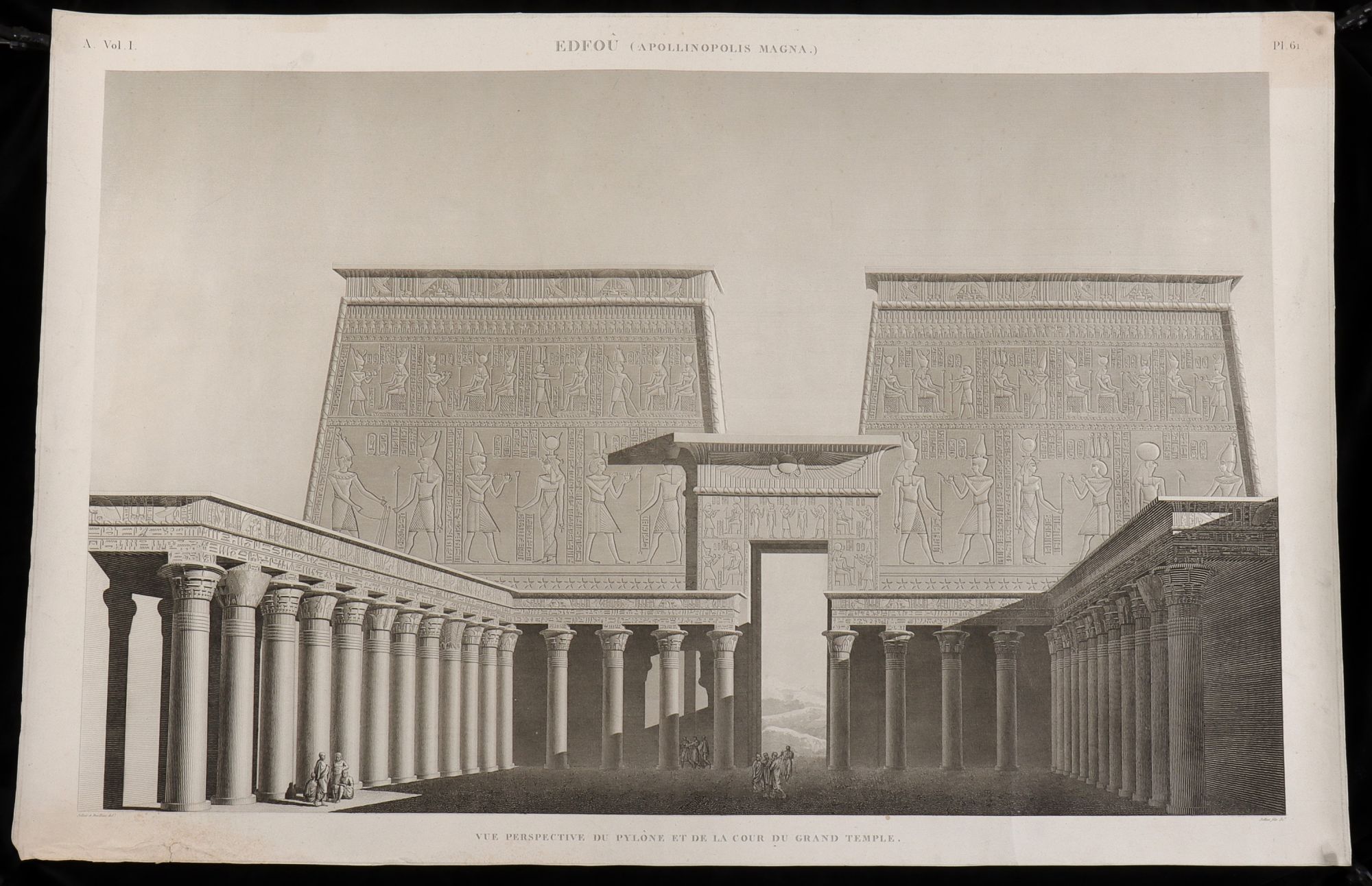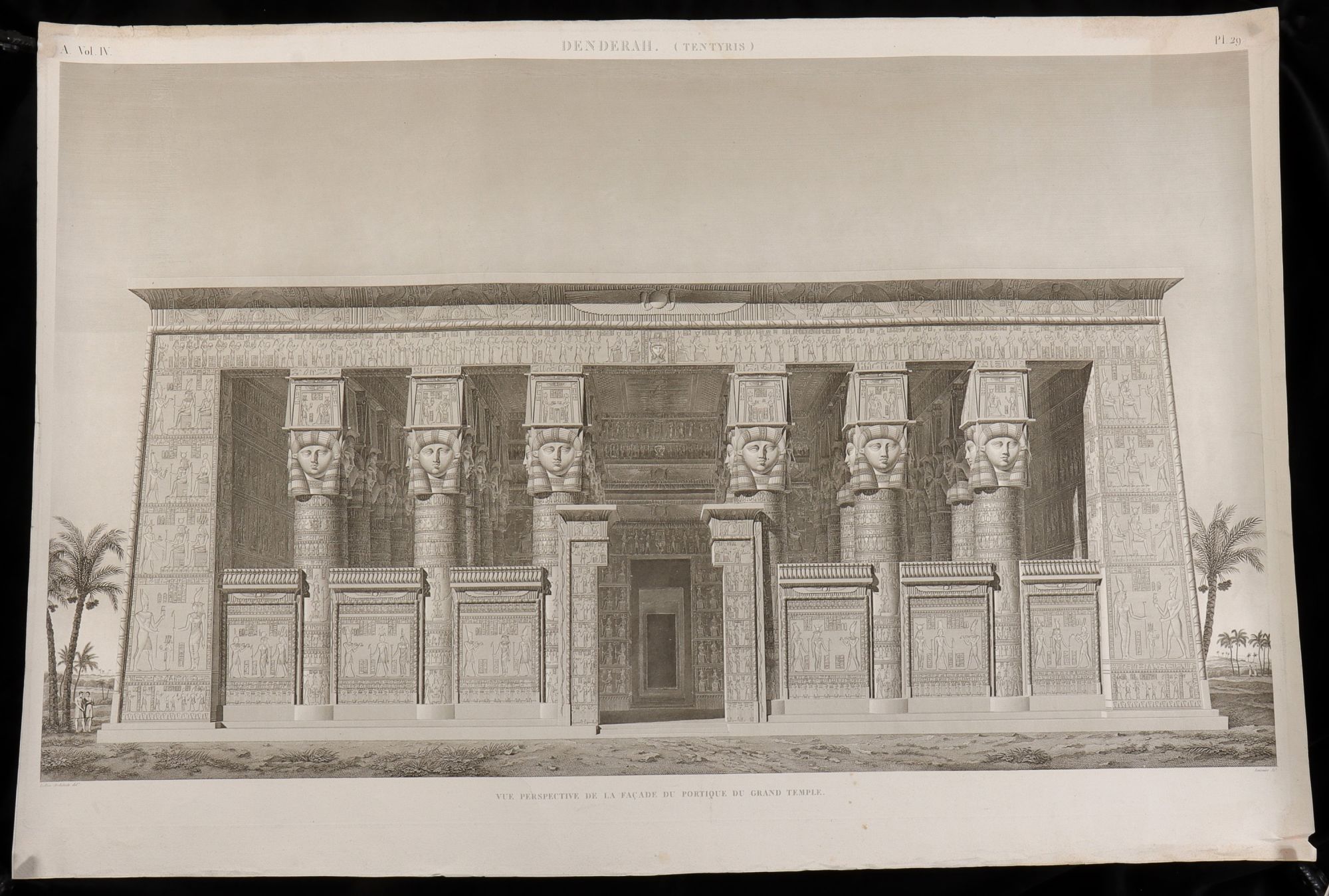 lotto di 6 grandi tavole tratte dall'opera "Description de l'Égypte", raffiguranti Denderah (Tenetyris) – 3 tavole, Thèbes (Karnak) – 2 tavole, Edfoù (Apollinopolis Magna), DFOU (APOLLINOPOLIS MAGNA). Acquaforte, 67 x 99 cm ca (cad. foglio). In buone condizioni generali.