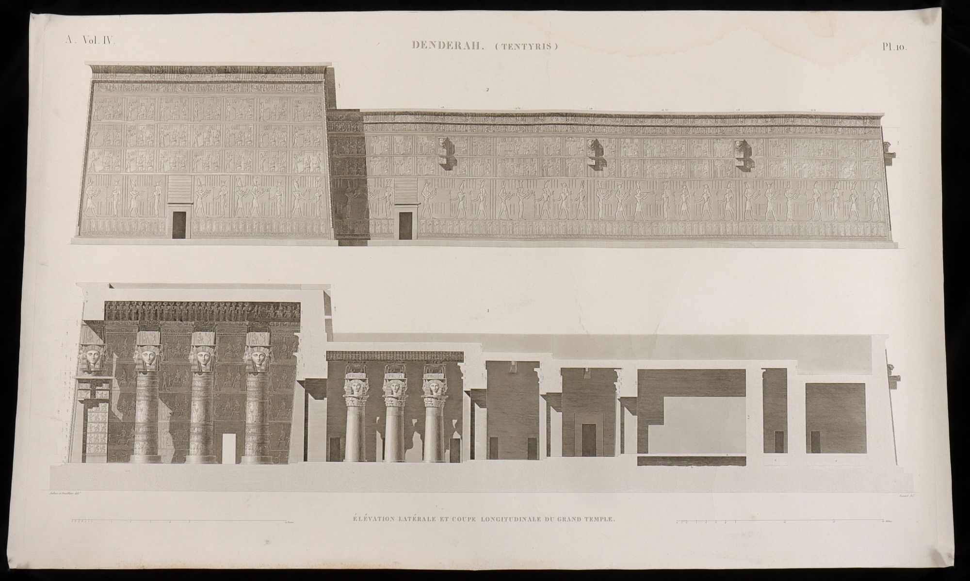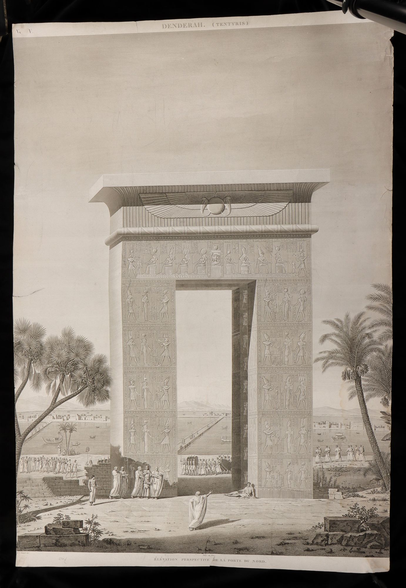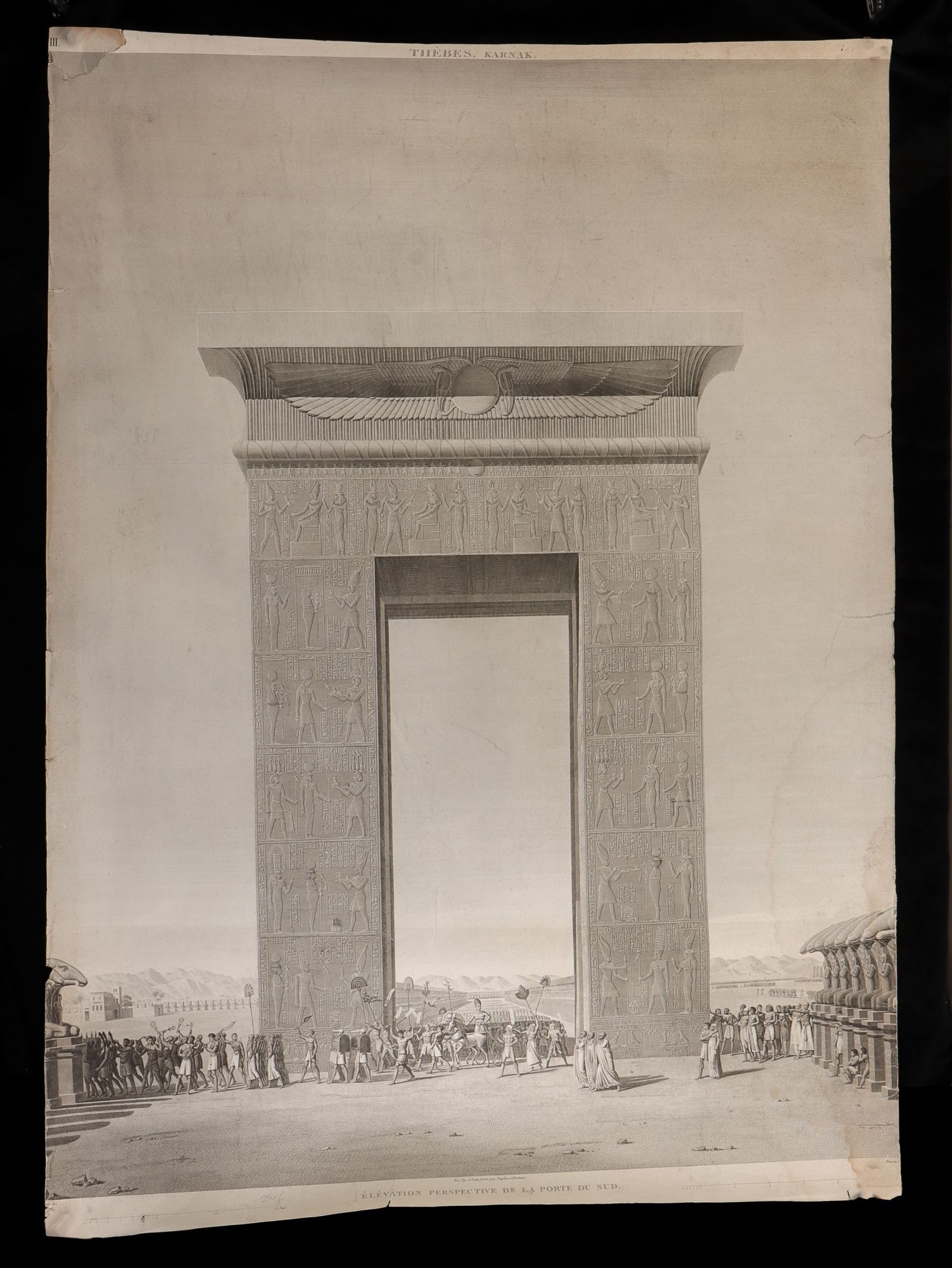 lotto di 6 grandi tavole tratte dall'opera "Description de l'Égypte", raffiguranti Denderah (Tenetyris) – 3 tavole, Thèbes (Karnak) – 2 tavole, Edfoù (Apollinopolis Magna), DFOU (APOLLINOPOLIS MAGNA). Acquaforte, 67 x 99 cm ca (cad. foglio). In buone condizioni generali.