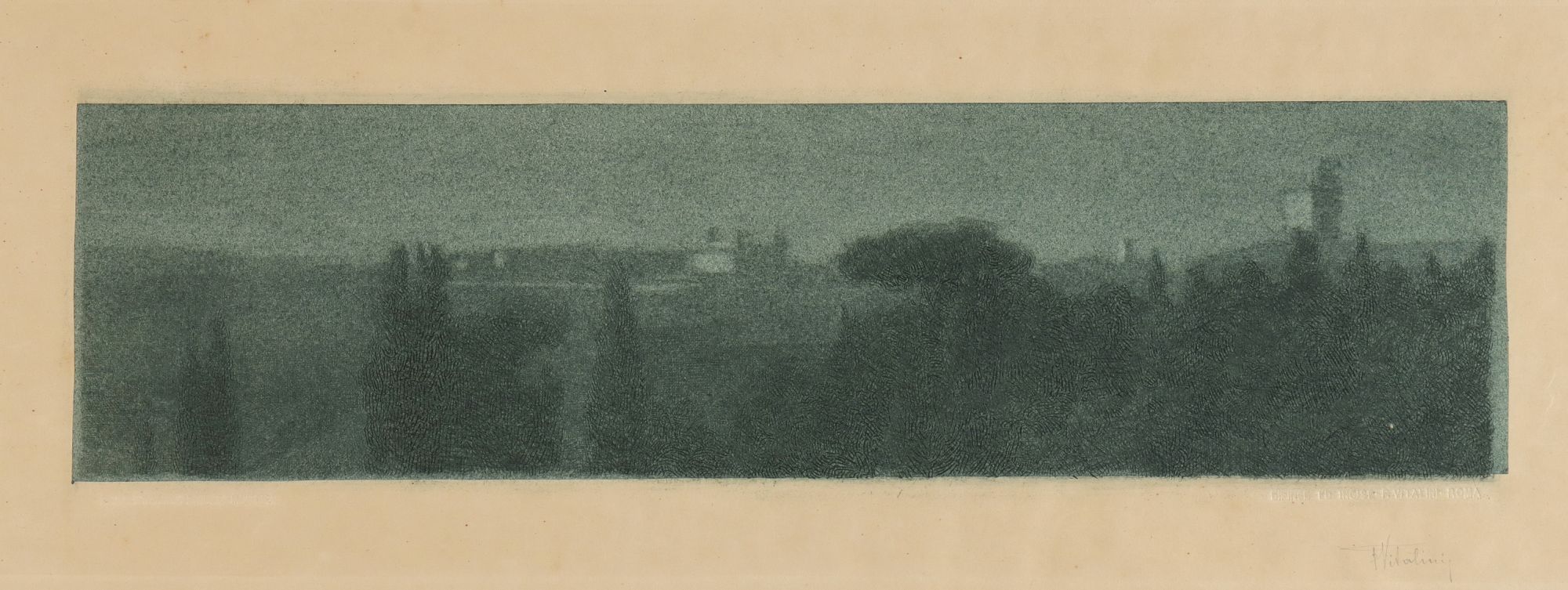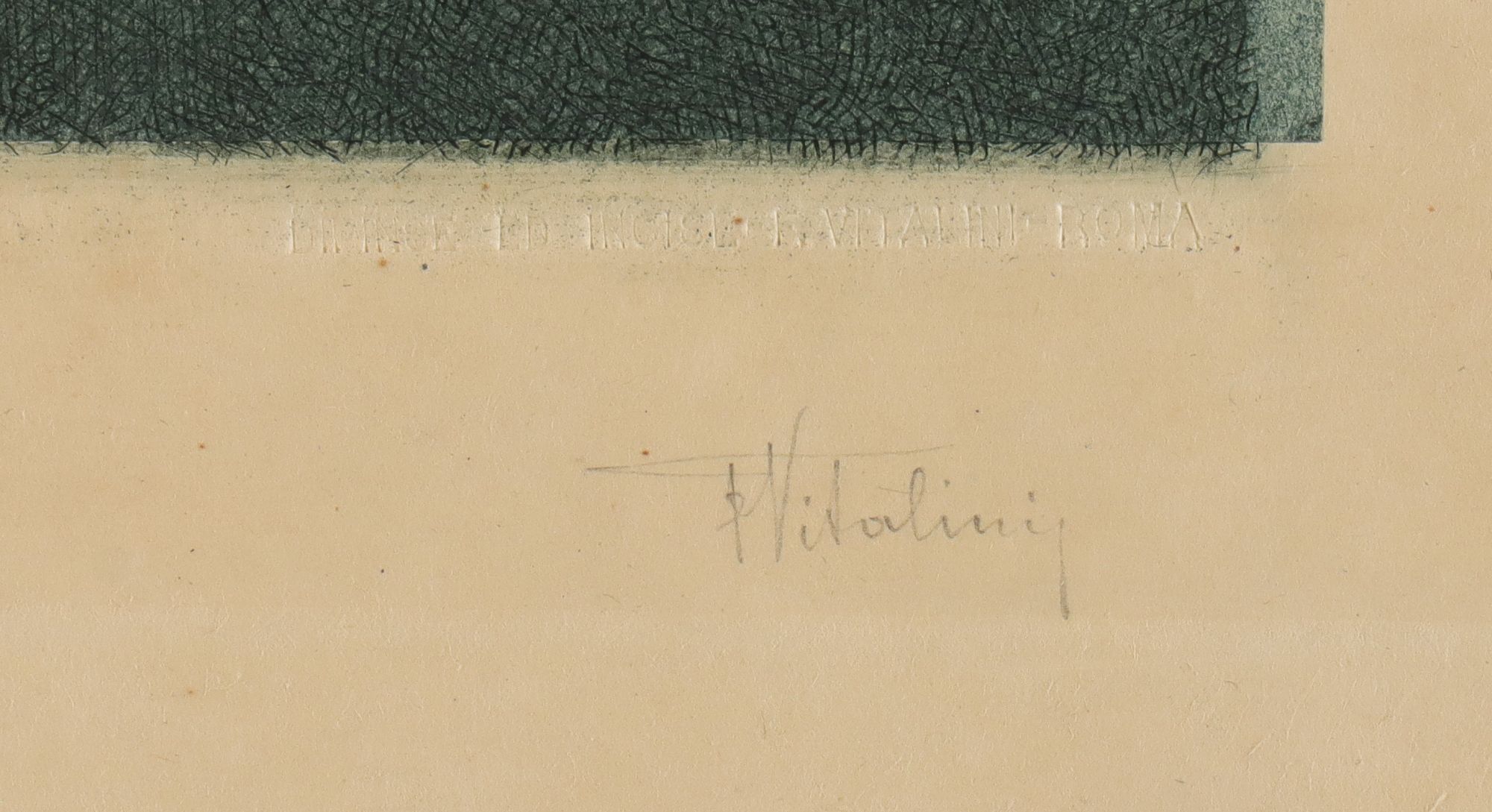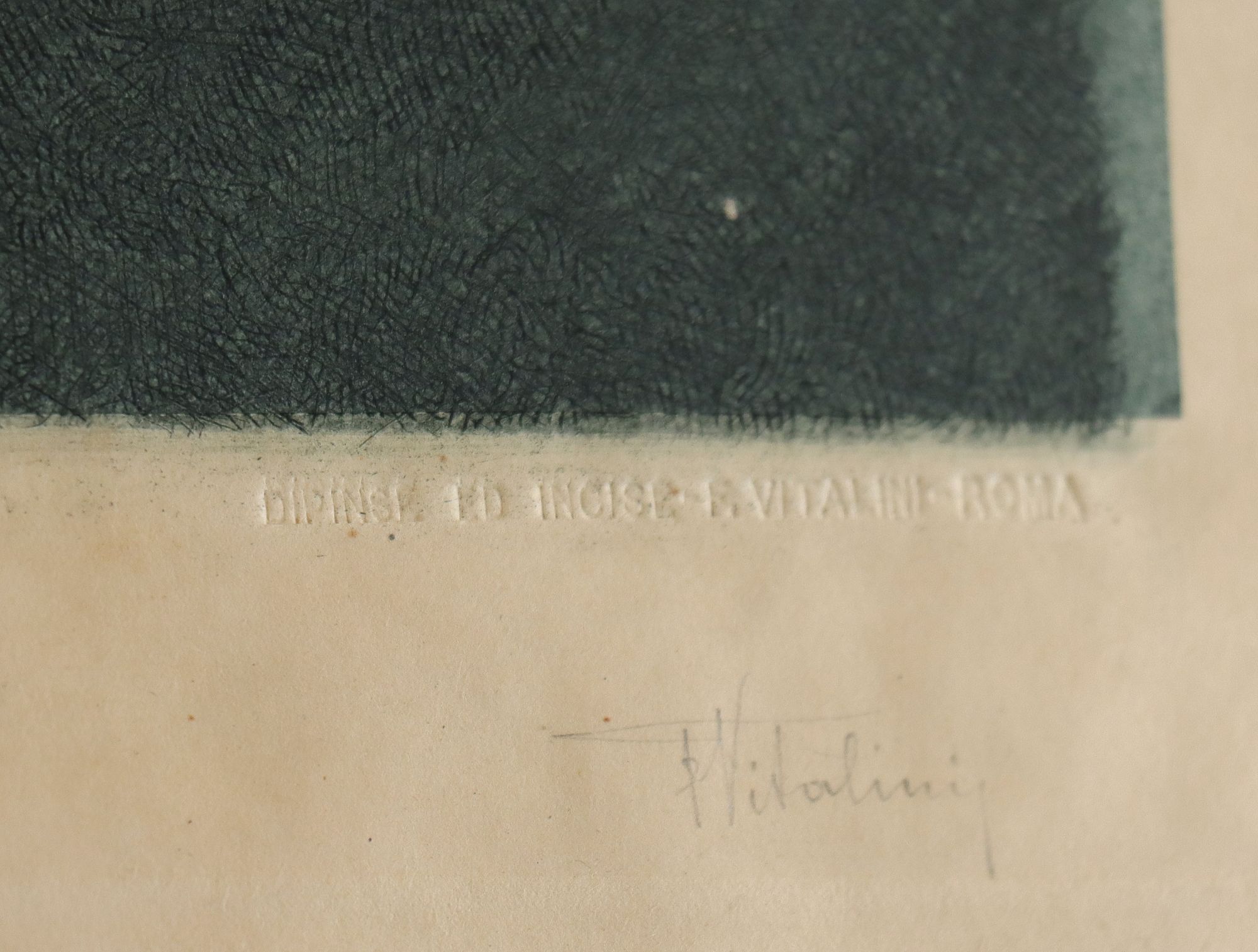 acquaforte e acquatinta ad inchiostro blu, 123 x 350 mm (lastra); 332 x500 mm (foglio). Timbrata a secco: "DALLA TORRE DELLE MILIZIE" sotto l'immagine a sinistra, "DIPINSE E INCISE - F. VITALINI - ROMA" sotto l'immagine a sinistra, "SERIE 2 N.° 1" in basso a sinistra. Firmato a matita sotto l'immagine a destra. Stupenda prova. Foglio in ottimo stato di conservazione, carta uniformemente brunita, lieve spellatura a sinistra, fuori dalla battuta della lastra.
