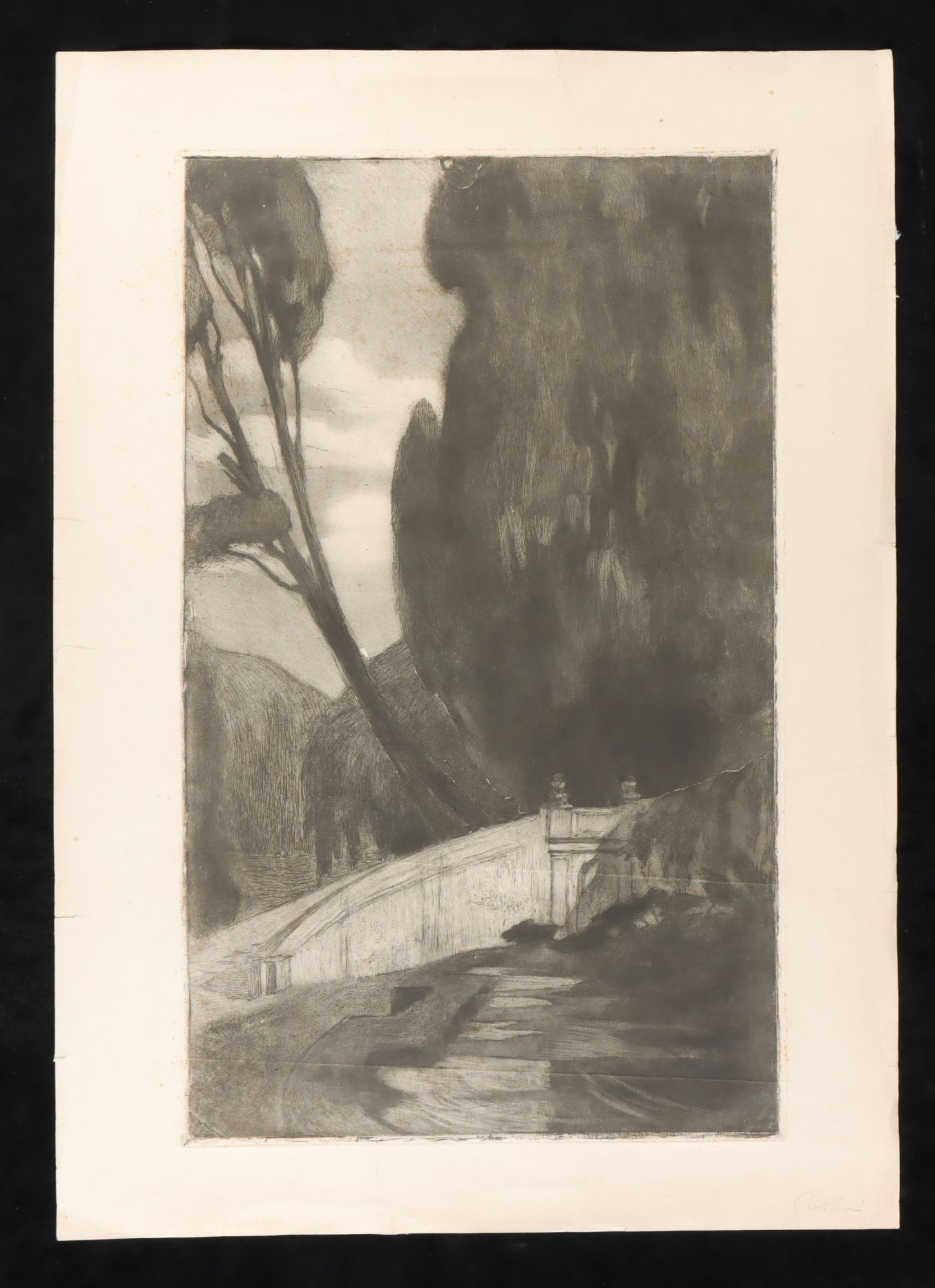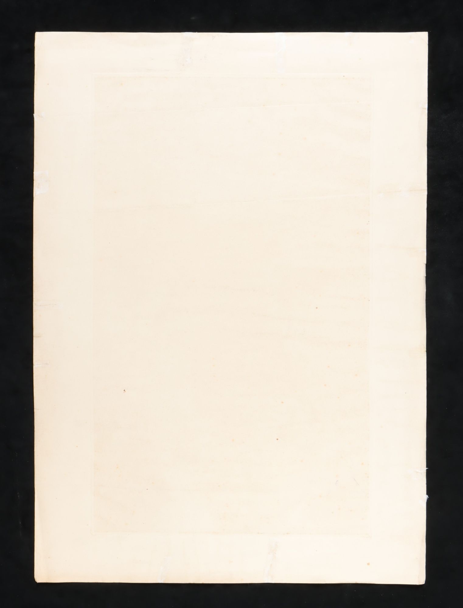acquaforte e acquatinta; cm 50x70 (foglio). Stampata su carta beige, firmata a matita in basso a destra in fondo al foglio fuori lastra. Margini grandi e completi, presenti alcuni strappi lungo i bordi e due pieghe nella tre/quarti inferiore, non visibili al recto della stampa. In condizioni generali discrete.