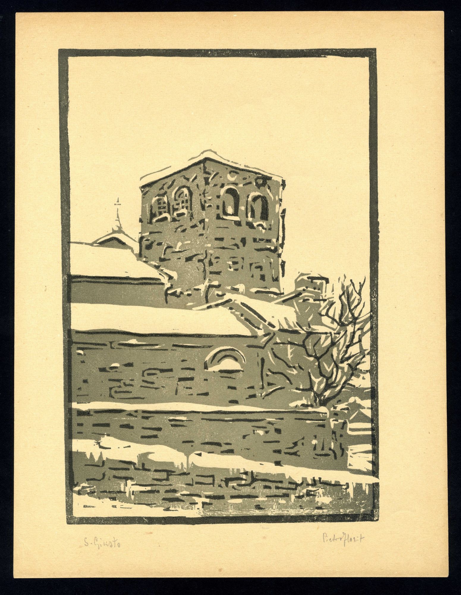 xilografia a due colori; cm. 23,7x30,3. Scorcio del paese di S. Giusto, con il campanile della Cattedrale sotto la neve, resa con delicatezza dall'uso cromatico del segno xilografico dei due colori e del terzo creato per sottrazione. Esemplare in perfetto stato di conservazione.