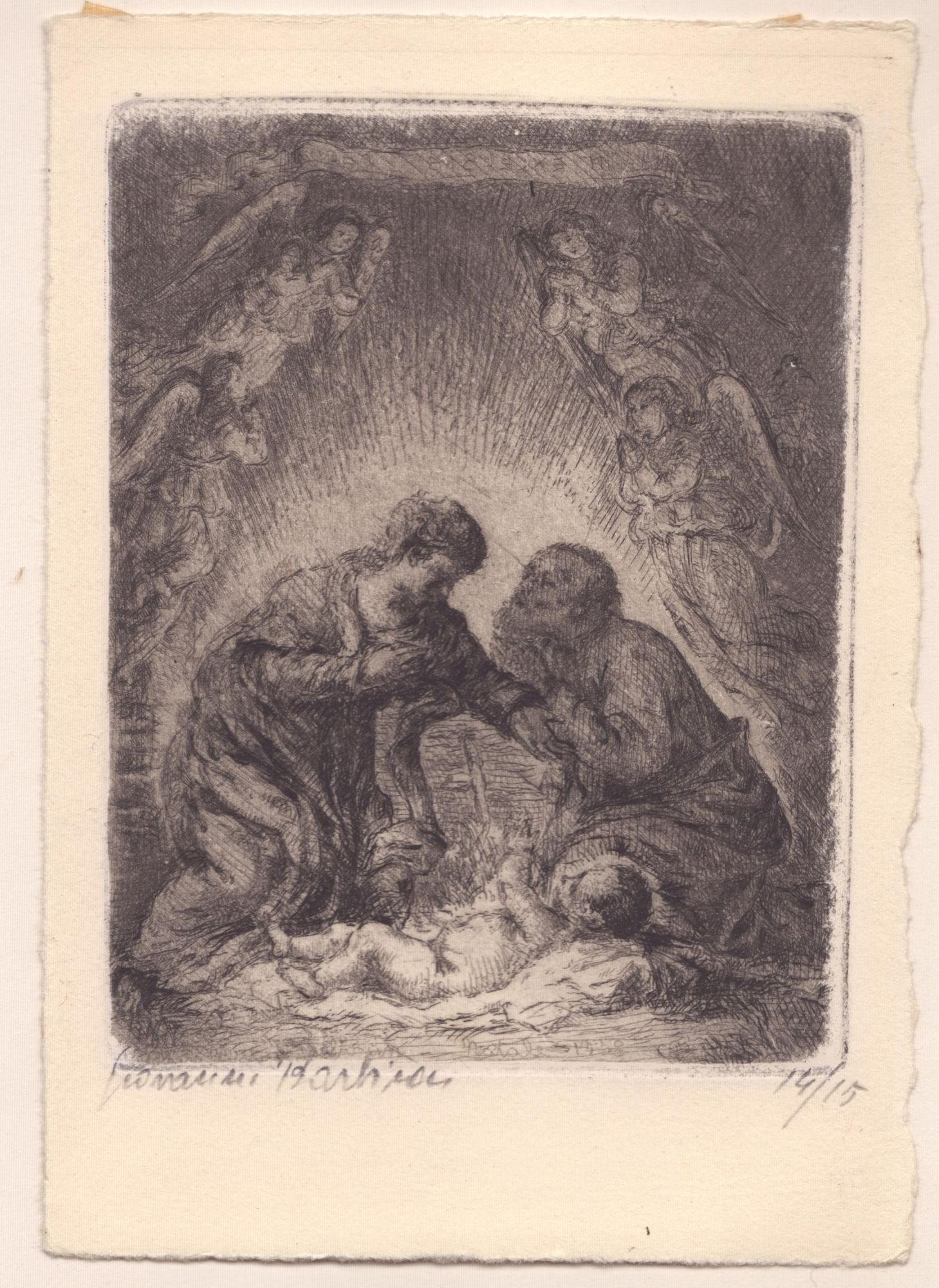 c. Natività, acquaforte, 125 x 97 mm (lastra), 165 x 115 mm (foglio), bella impressione su cartoncino, datata in lastra: Natale 1958. Firmata a matita Giovanni Barbisan, tiratura 14/15