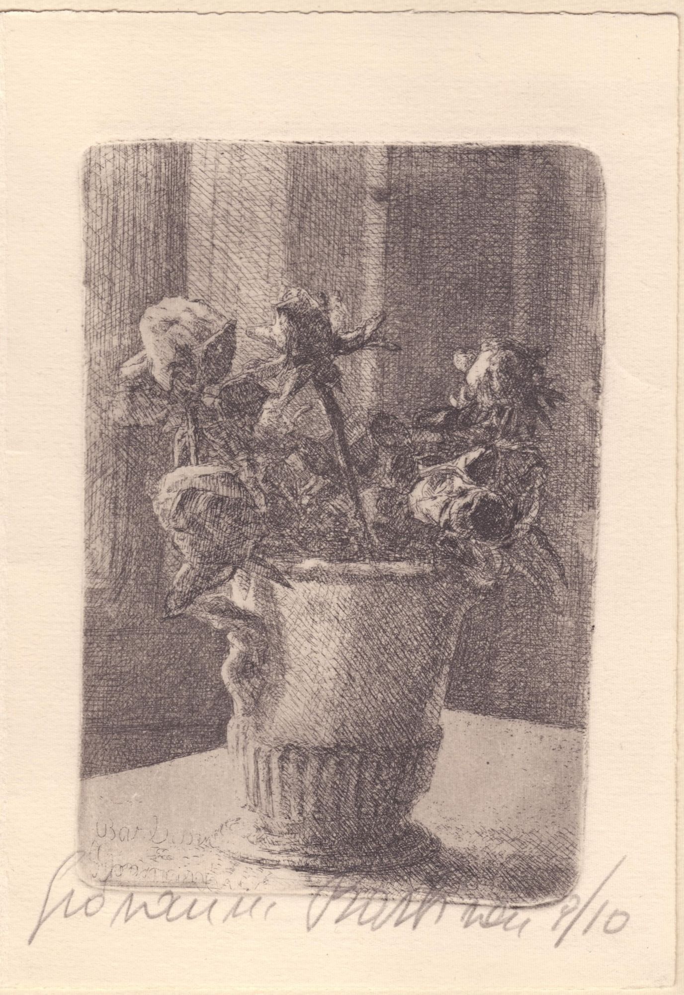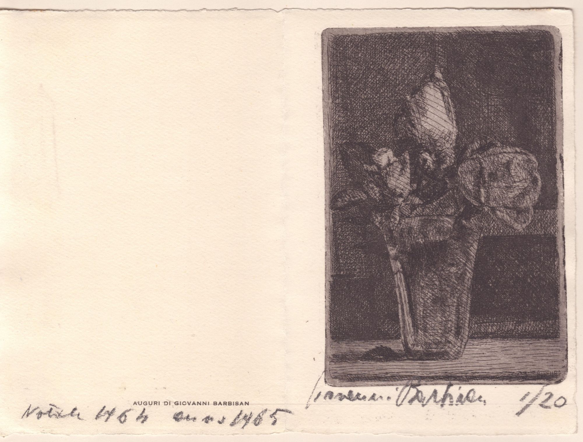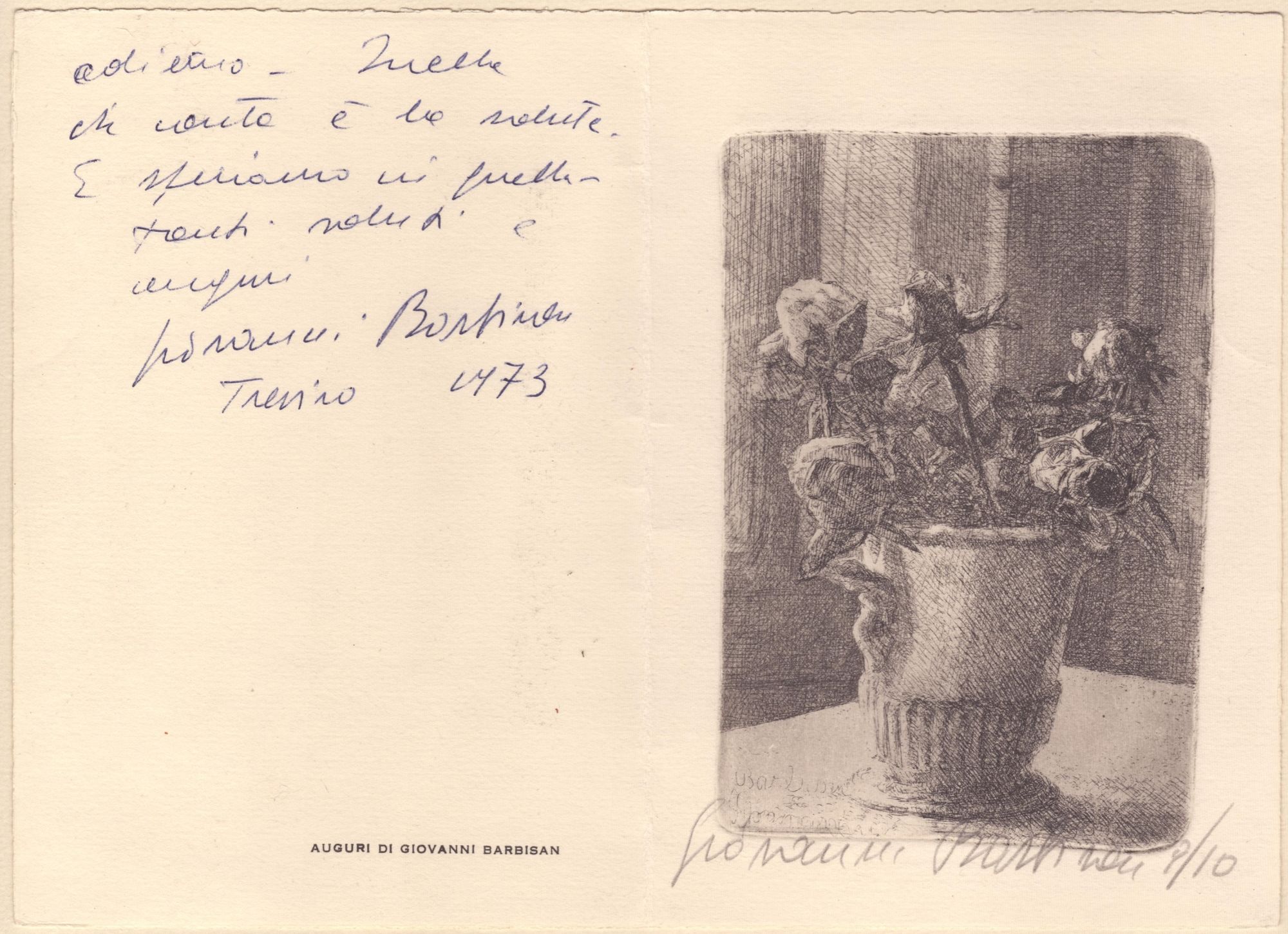 b. Vaso con fiori, acquaforte, 127 x 85 mm (lastra), bella impressione su cartoncino (bifolio). Firmata a matita Giovanni Barbisan, tiratura 9/10, nota autografa firmata sulla parte sinistra del foglio, datata Torino 1973