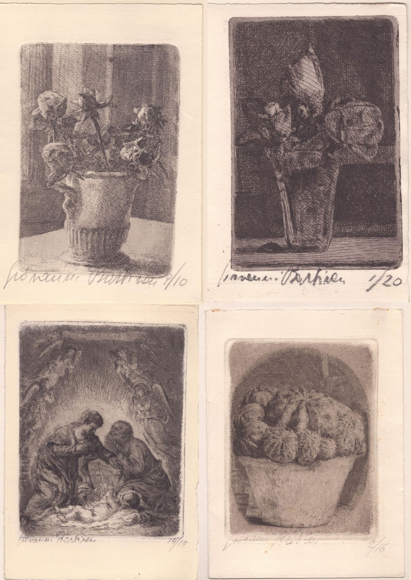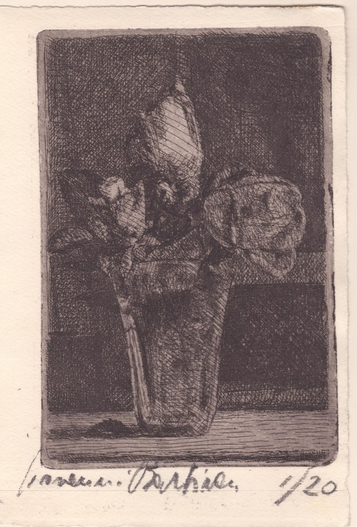 a. Vaso con tre fiori, acquaforte, 137 x 92 mm (lastra), bella, fresca e ben inchiostrata impressione con toni di nero profondi su cartoncino (bifolio). Firmata a matita Giovanni Barbisan, tiratura 1/20, nota autografa sulla parte sinistra del foglio