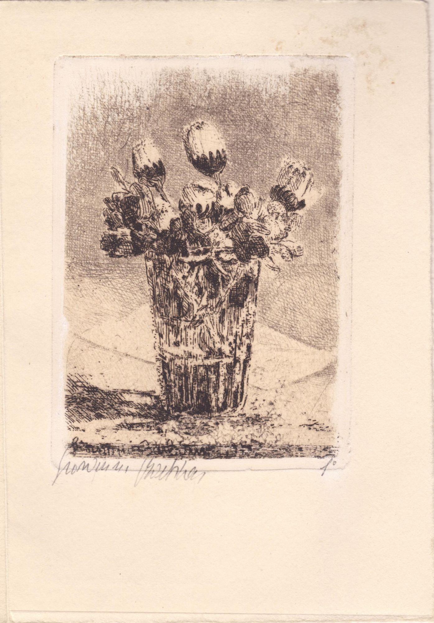 c. Vaso con fiori, acquaforte, 113 x 80 mm (lastra), bella e fresca impressione su cartoncino (bifolio), firmata a matita, in basso a destra: 1°
