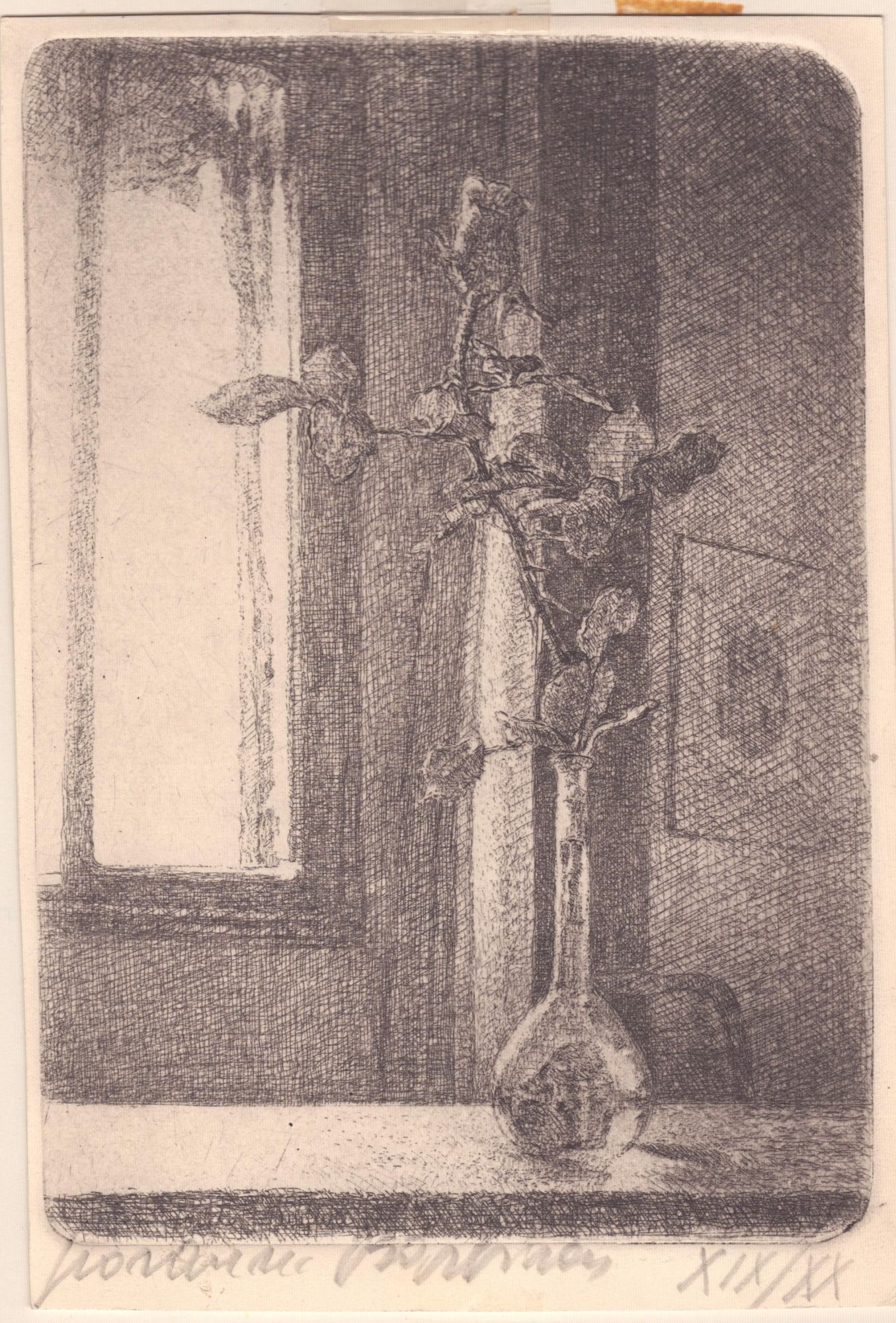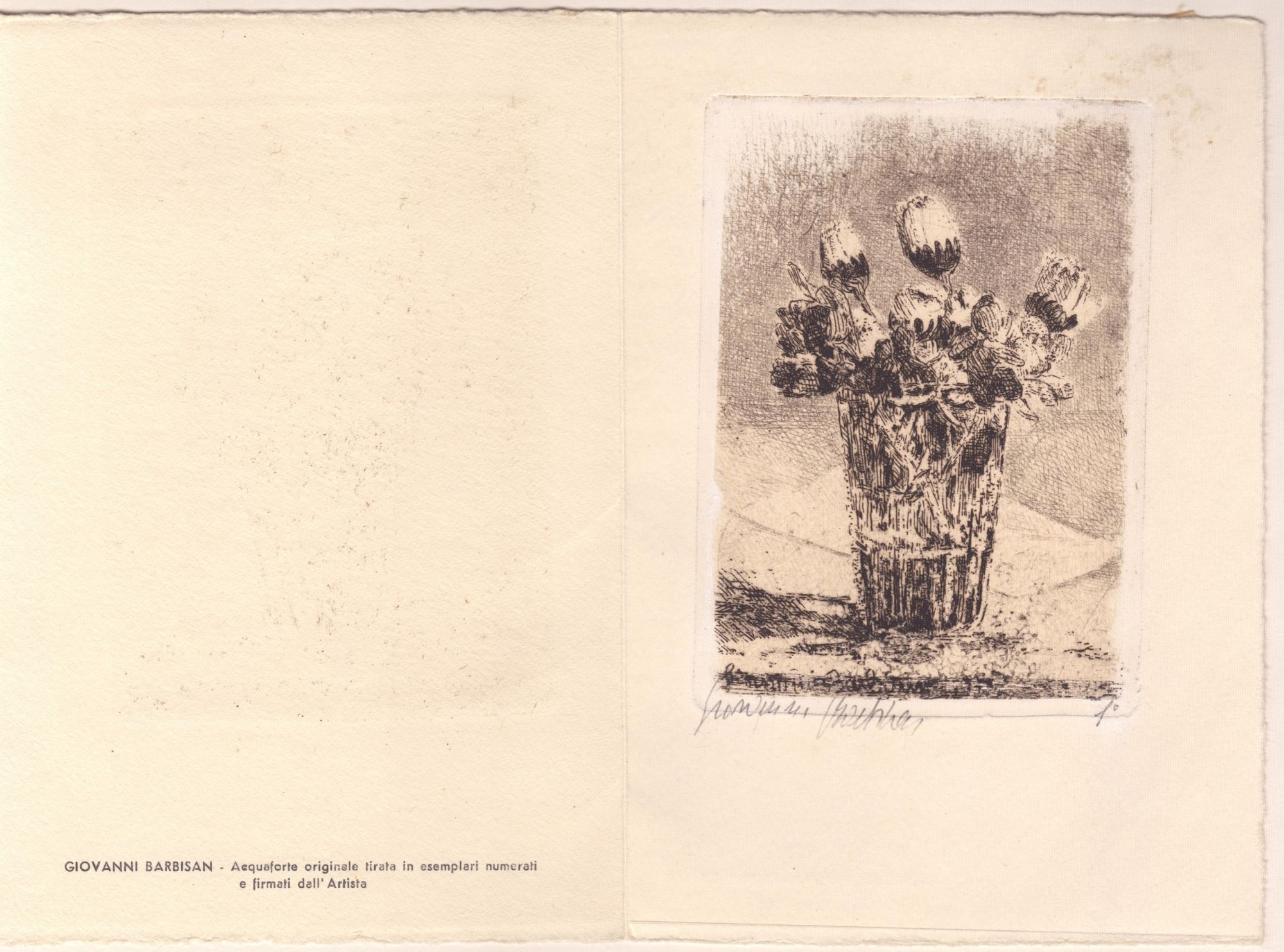 b. Vaso con rosa, acquaforte, 145 x 102 mm (lastra), 156 x 107 mm (foglio). Firmato a matita, tiratura XIX/XX. Stampata su cartoncino, al verso timbro: ACQUAFORTE ORIGINALE FUORI COMMERCIO DI GIOVANNI BARBISAN