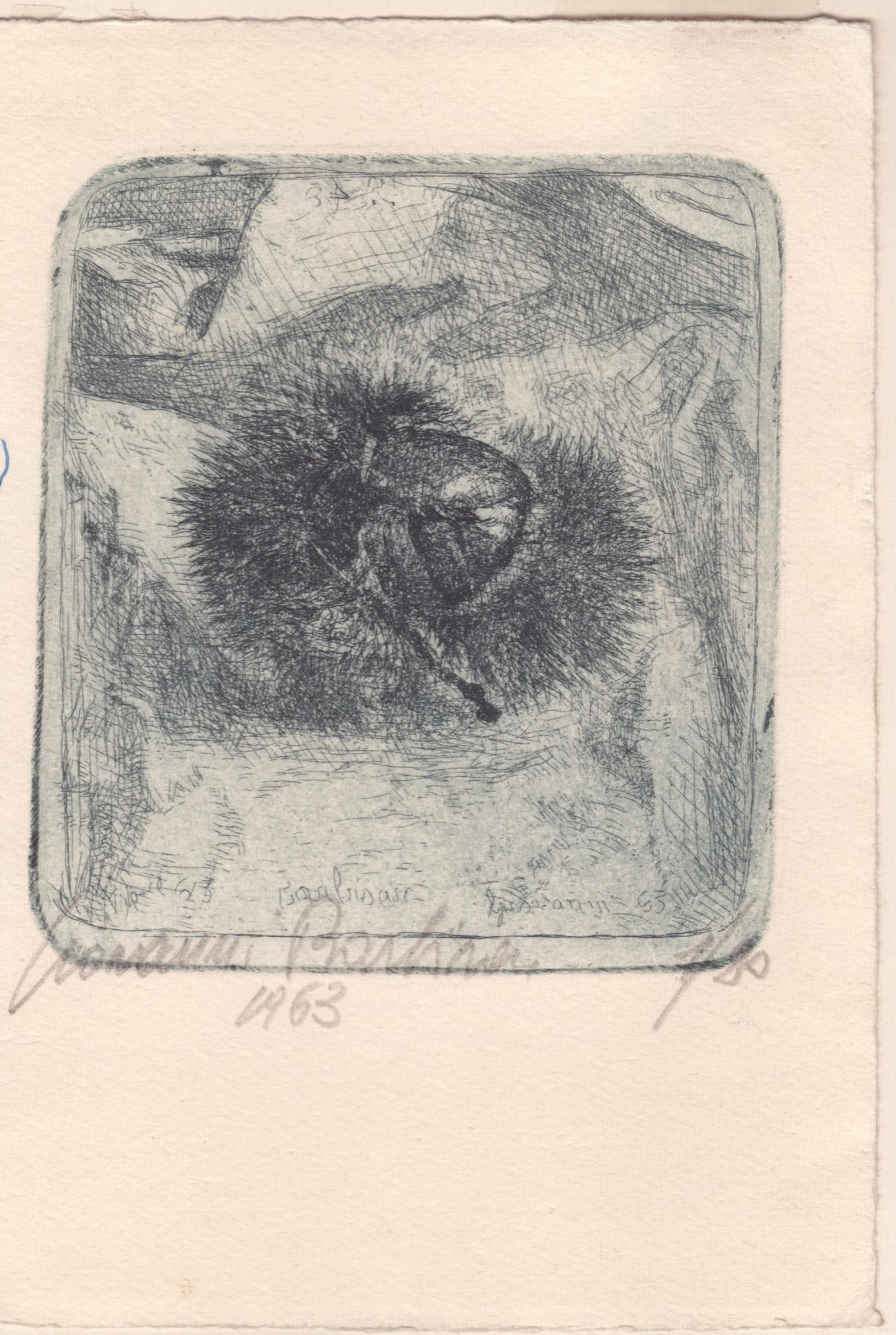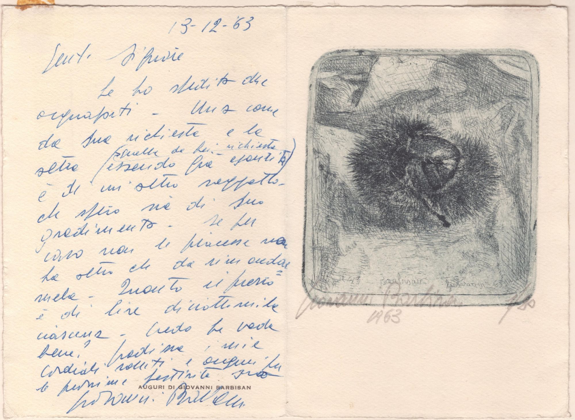 a. Castagna, acquaforte ad inchiostro blu, 100 x 92 mm (lastra), bella e fresca impressione su cartoncino (bifolio), firmata e datata in lastra, firmata e datata a matita, tiratura 1/20. Con una lettera autografa firmata (Giovanni Barbisan) a sinistra, datata 13-12-63.