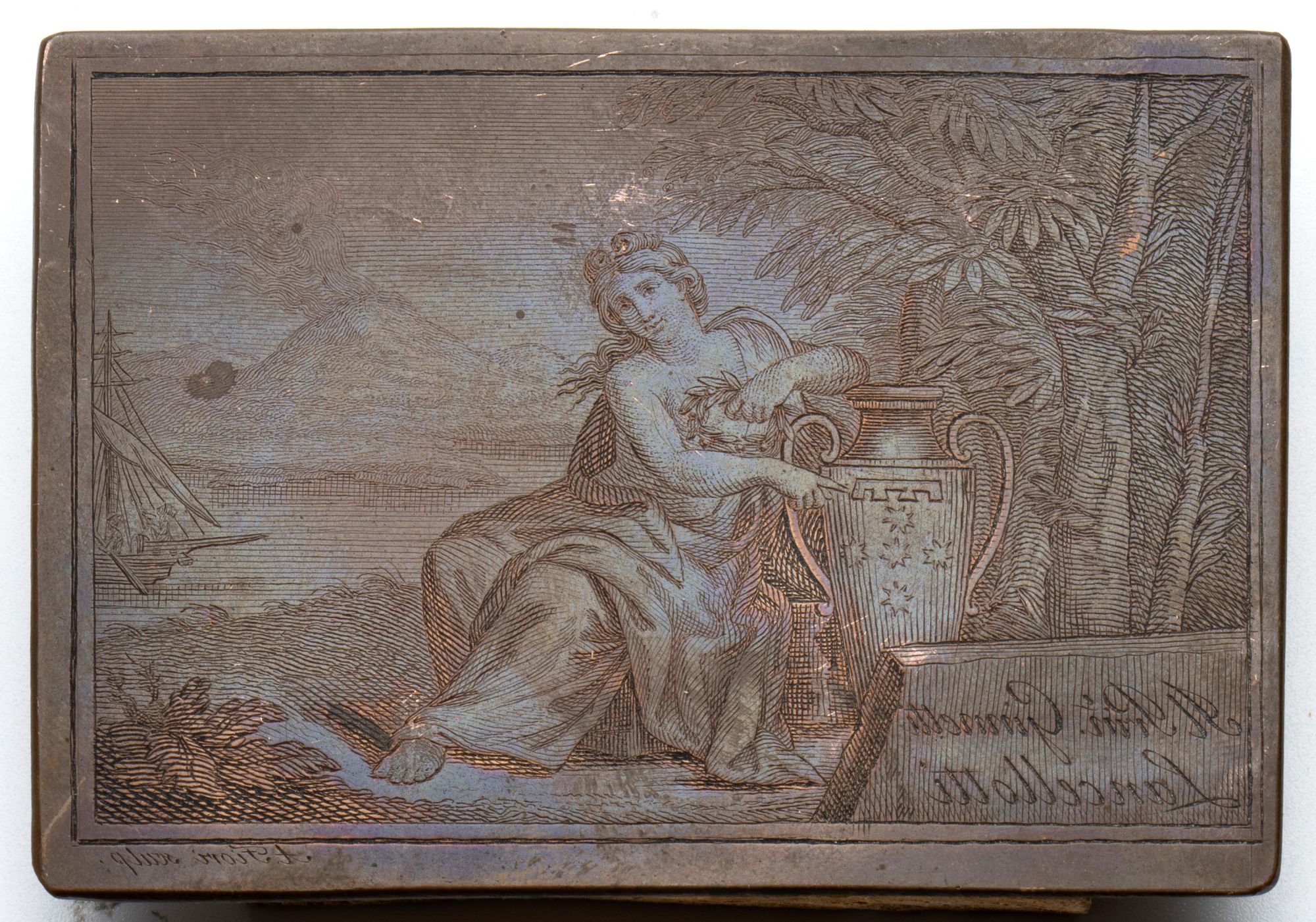 lastra di rame, 62 x 90 mm. Con firma e dedica, buono stato.