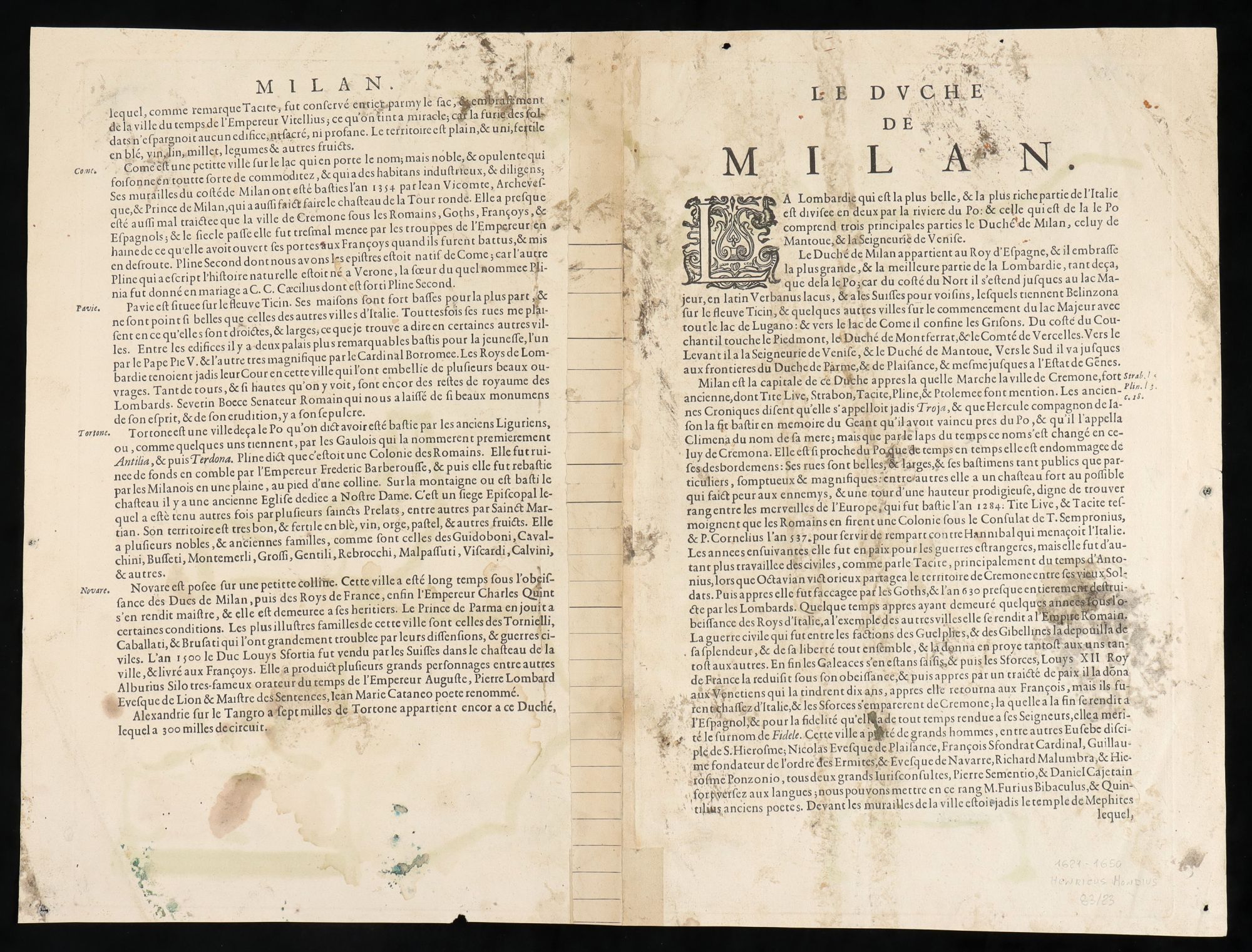bulino e acquaforte, 405 x 545 mm. Mappa di Ducato di Milano tratta da "Nouveau Theatre du Monde ou Nouvel Atlas". Testo in francese al verso. Bella impressione su due fogli di carta vergata uniti. Consueta piega centrale rinforzata ale verso. Qualche macchia e qualche piccolo foro. Bella coloritura coeva. In generale in buono stato.