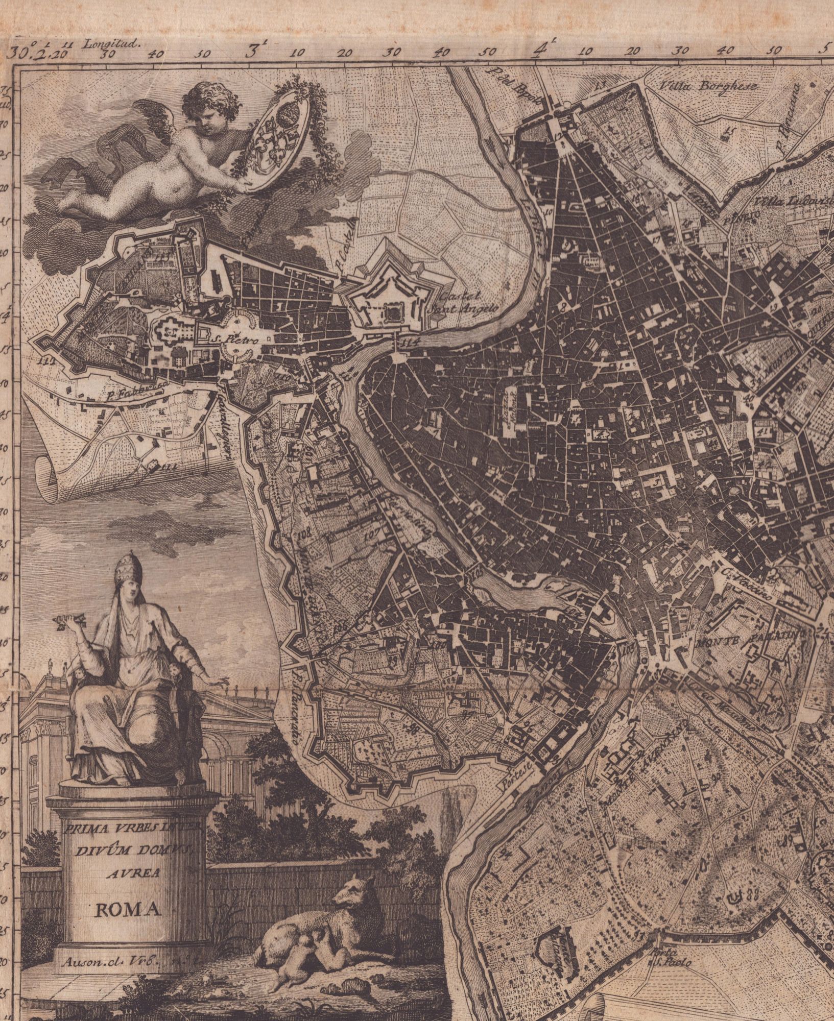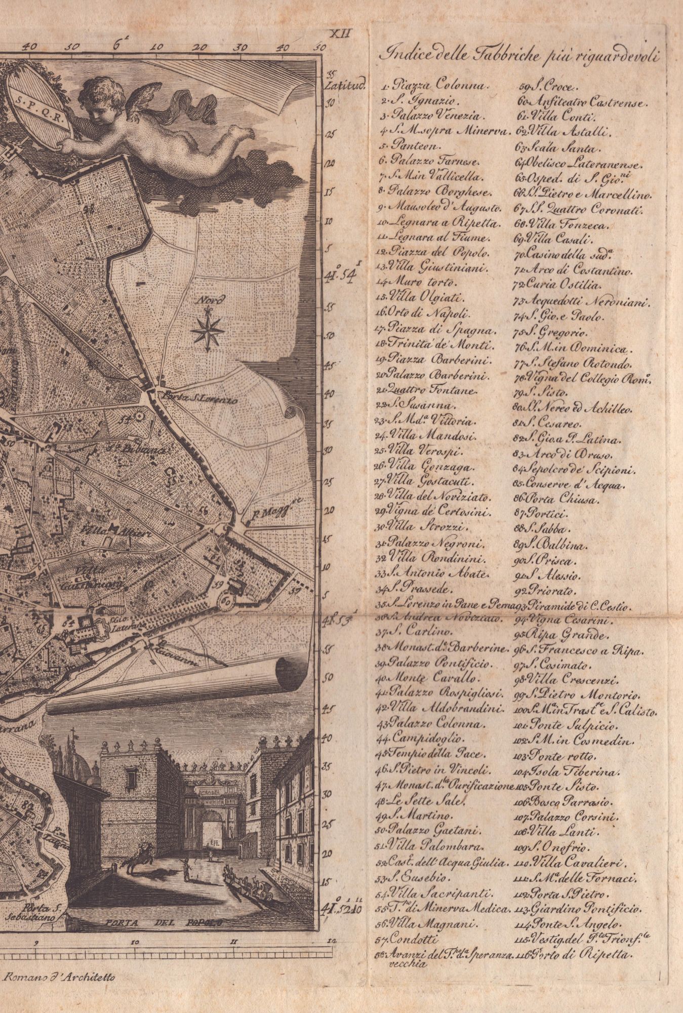 acquaforte, 312 x 445 mm. Riduzione di una famosa pianta di Roma di Noli, con indice. Bella impressione su carta vergata. Un piega verticale e una orizzontale. Usure lungo le pieghe. Leggera fioritura. Margine sinistro mancante 8anche una millimetrica mancanza della parte impressa della lastra in basso a sinistra).