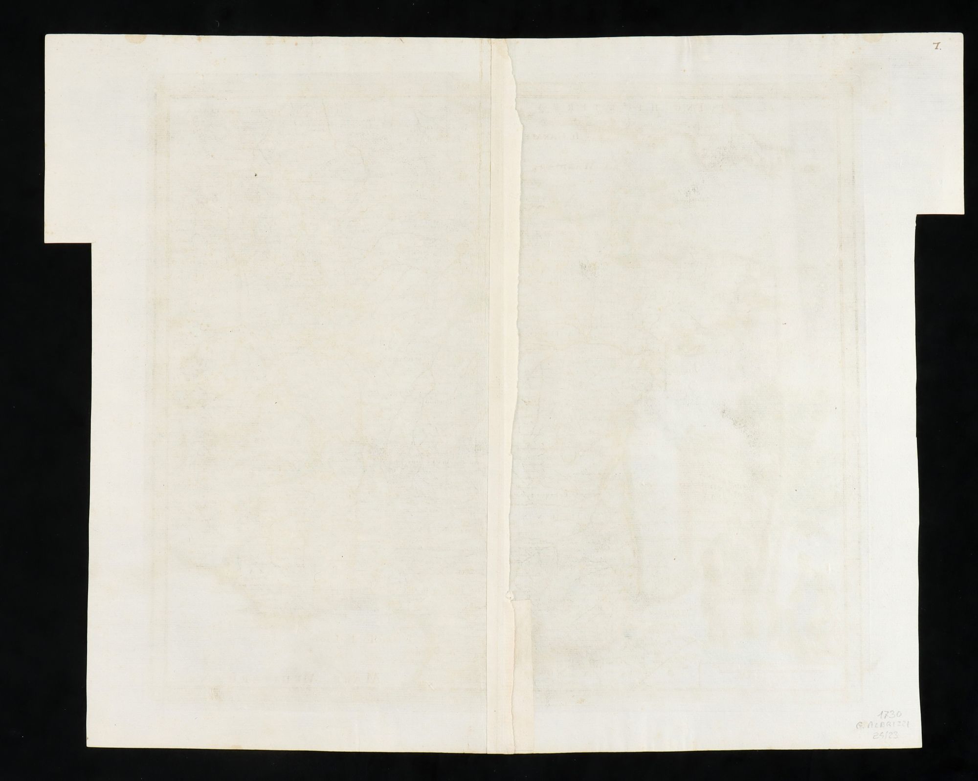 bulino e acquaforte, 375 485 mm. Bella mappa di Francia tratta da "Atlante Novissimo del Sigr. Guglielmo de L’Isle". Bella impressione su due fogli di carta vergata con filigrana uniti. Consueta piega centrale. Coloritura coeva. Ottimo stato salvo un ritaglio largo circa 2,5 cm sul margine destro e sul margine sinistro.
