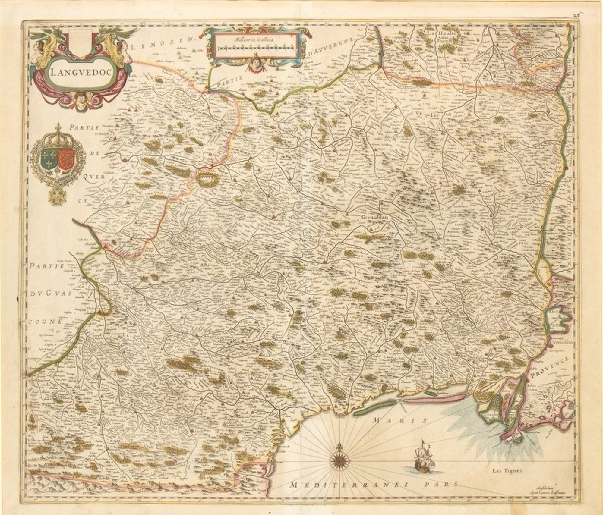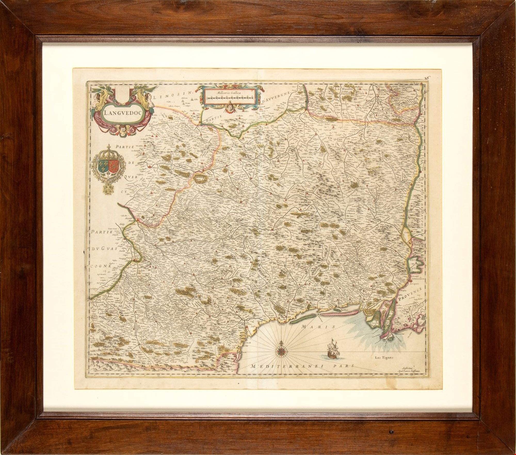 bulino e acquaforte, 49 x 56 cm, mappa della Linguadoca nel sud della Francia, stampata su carta vergata, con coloritura coeva. Bella impressione. Foglio in ottimo stato, con consueta piega centrale, lieve macchie sul margine inferiore. Con la cornice, vetro e passe-partout (70x 80 x 3 cm). La stampa non è stata esamina fuori dalla cornice.