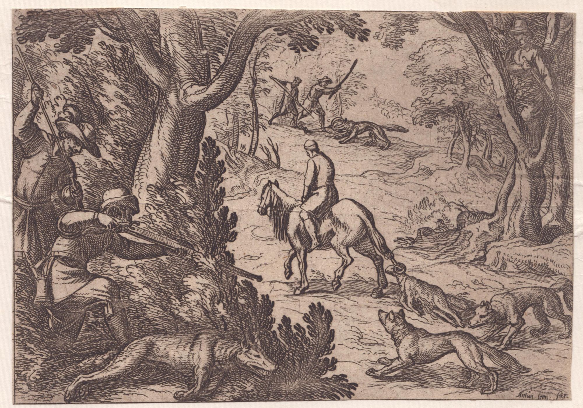 a. Antonio Tempesta, Caccia al lupo con l'archibugio. Acquaforte, 97 x 147 mm. Dalla serie "46 cacce diverse". Bellissima impressione su carta vergata sottile, esemplare rifilato, in ottimo stato di conservazione. Con passe-partout.