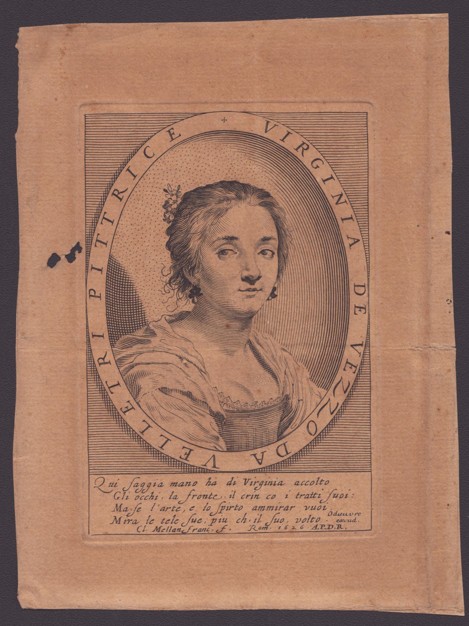 c. Claude Mellan, Virginia de Vezzo da Velletri Pittrice. Acquaforte, 159 x 120 mm (foglio). Stampata su carta vergata. Foglio brunito, con traccia di piega orizzontale e due buchi sul margine sinistro.