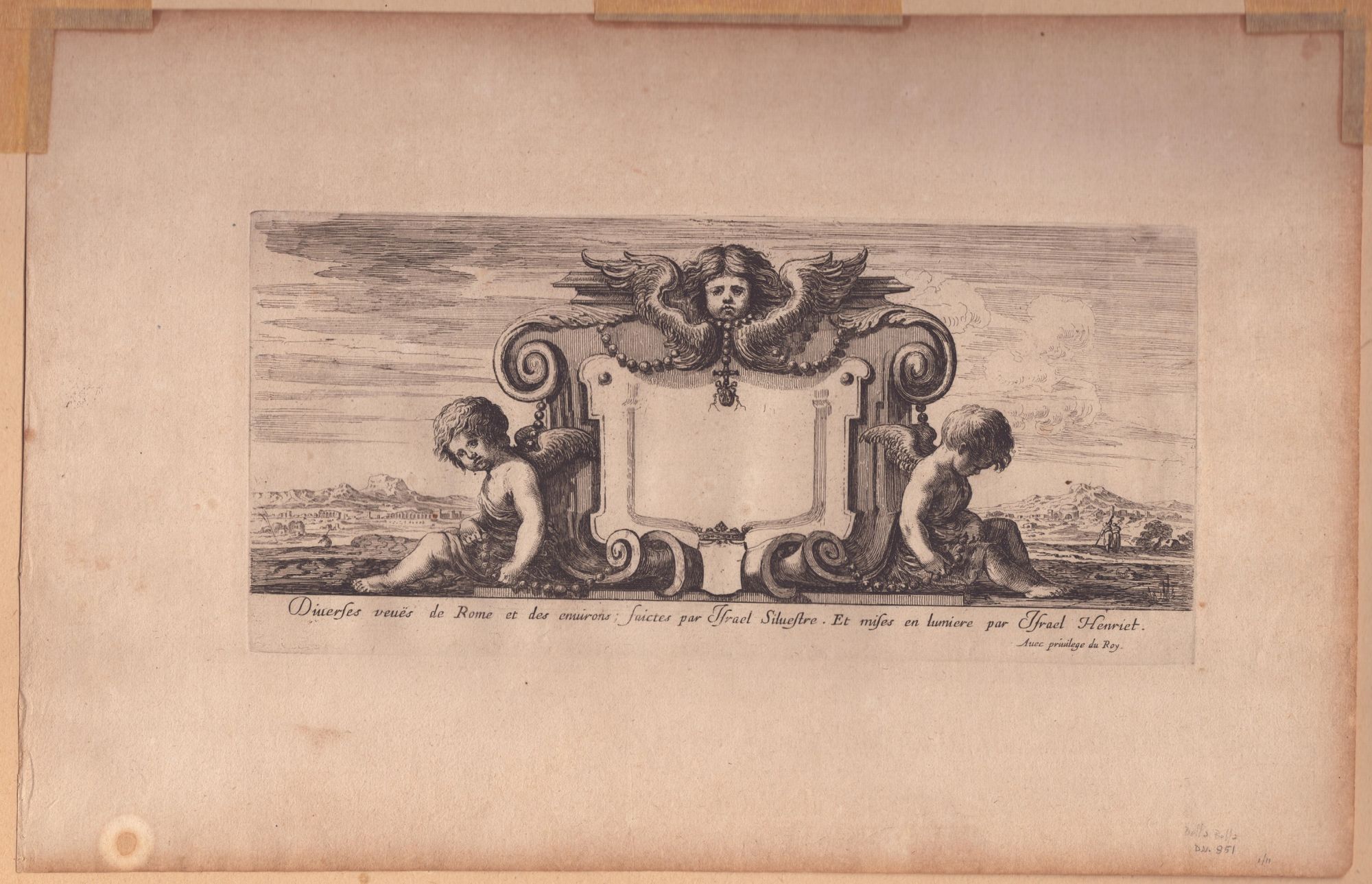 b. Ilsrael Silvestre, frontespizio del "Diverse vedute di Roma e suoi dintorni", acquaforte, 114 x 249 (lastra), 24 x 35 cm (foglio). Bellissima impressione su carta vergata sottile. In ottimo stato di conservazione salvo delle ossidazioni lungo i bordi. Con passe-partout.