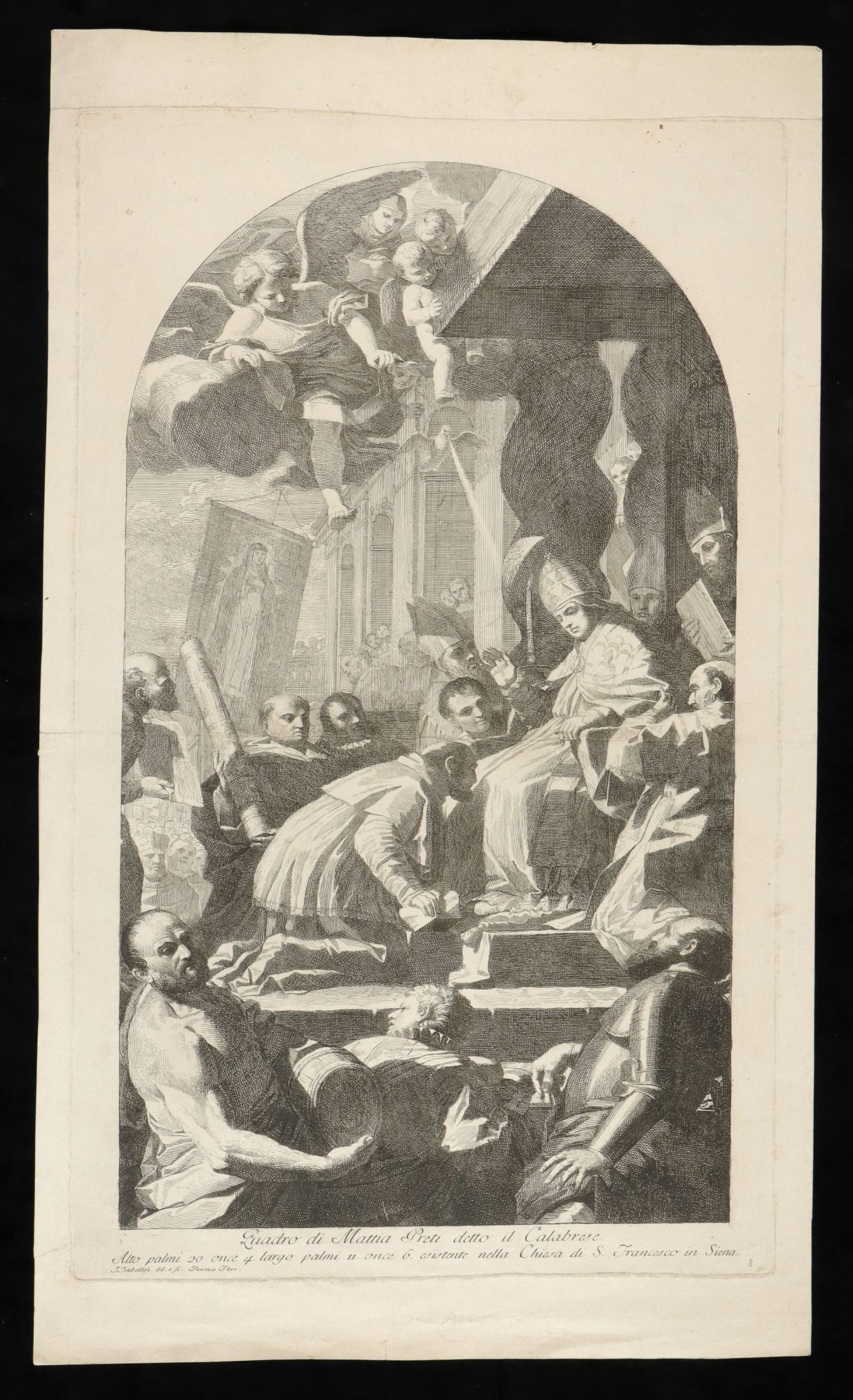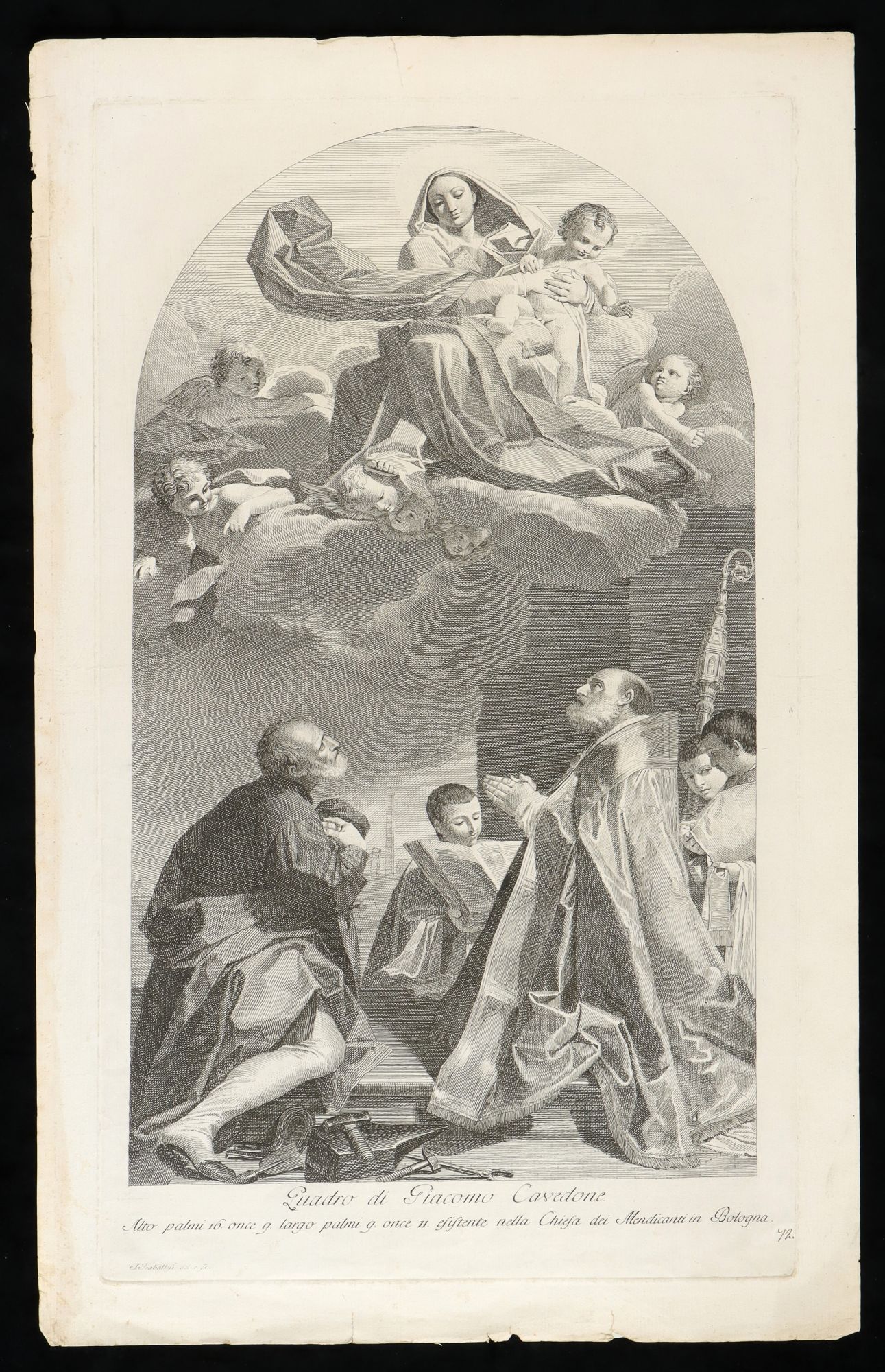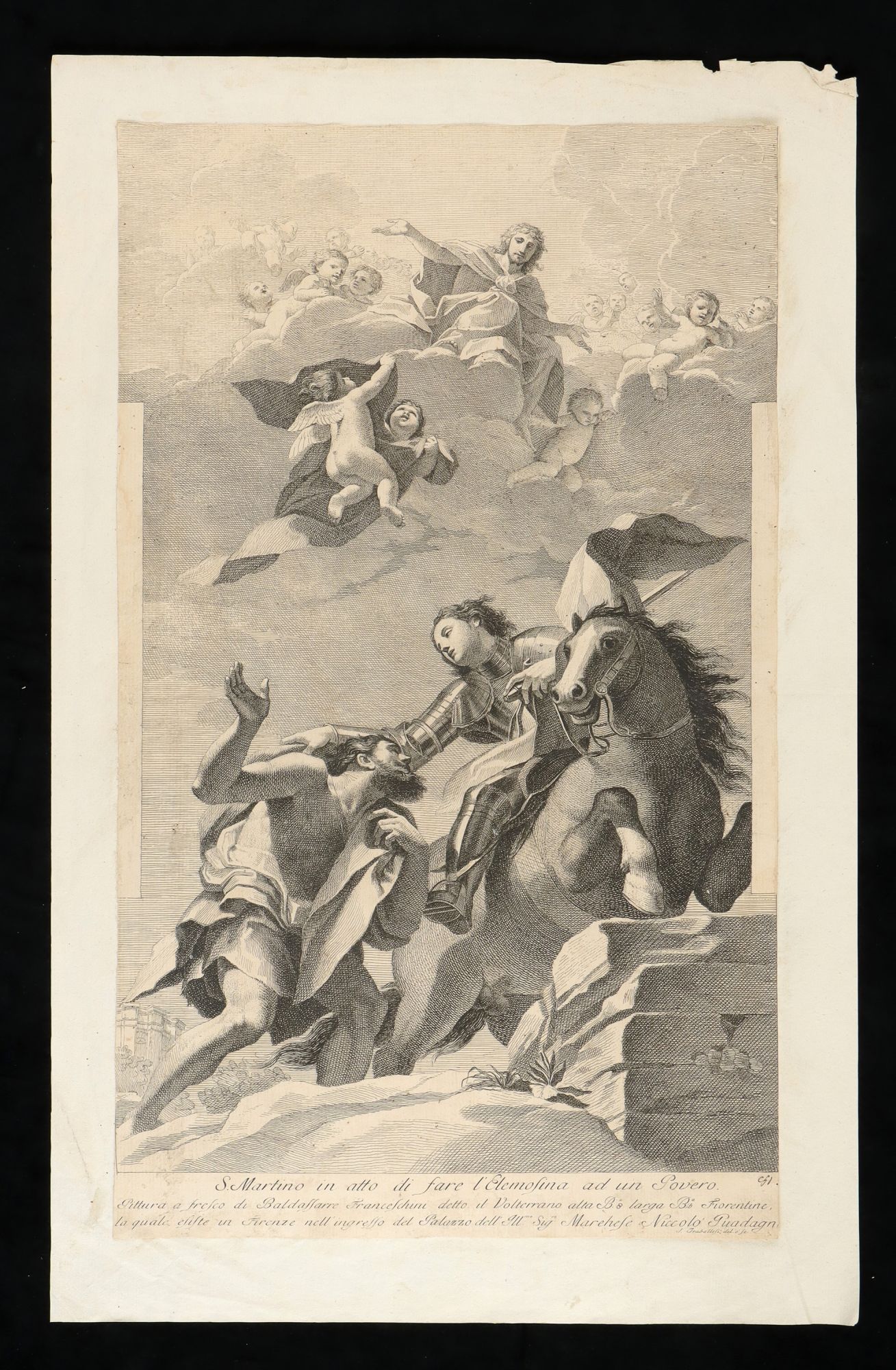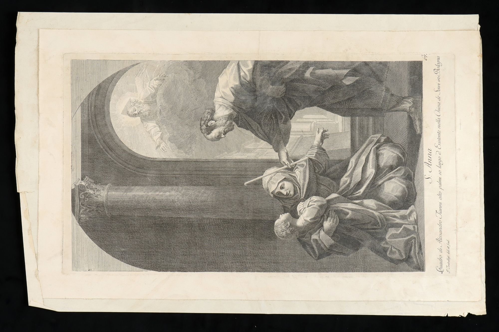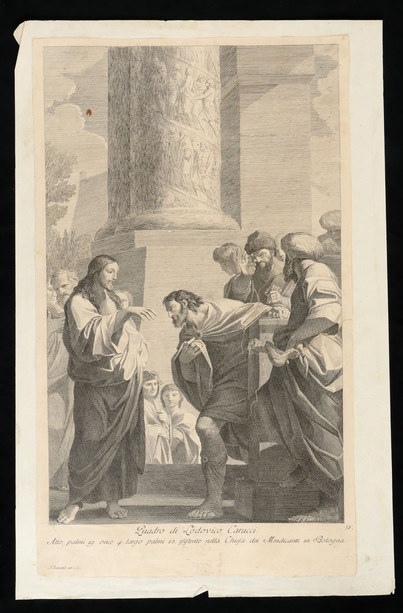 bulino, 50 x 30 cm ca. cad. S. Anna/ S. Martino in atto di fare l'Elemosina an un Povero/ Quadro di Mattia Preti detto il Calabrese / Quadro di Ludovico Carracci / Quadro di Giacomo Cavedone. Stampate su carta vergata. In buono stato generale. Qualche restauro. Tre incisioni controfondate.
