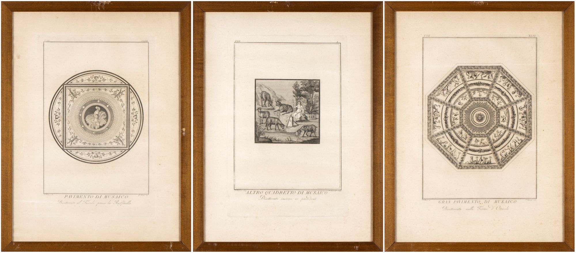 Lotto di 3 incisioni a bulino, 48 x 32 cm (lastra); 61,5 x 45,5  cm (foglio). Belle impressioni, fogli in buono stato di conservazioni, con leggere ossidazioni q qualche segno di fioritura. Con cornici in legno e vetro (67 x 51 x 1 cm cad.)