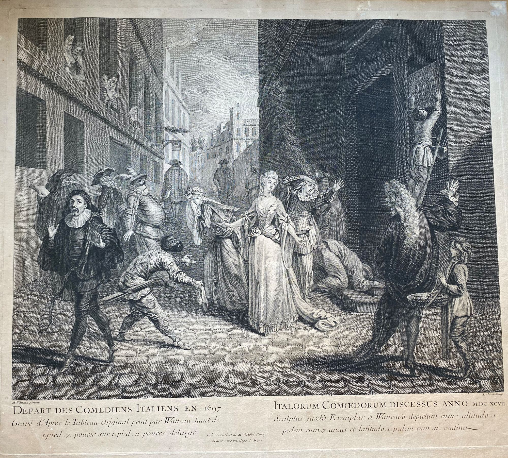 Louis Jacob (1712 - 1802) da Watteau, La partenza da Parigi dei commedianti Italiani nel 1697. Bulino, 41 x 46 cm. Carta ossidata, con qualche macchia. Incollata lungo il bordo superiore su supporto.