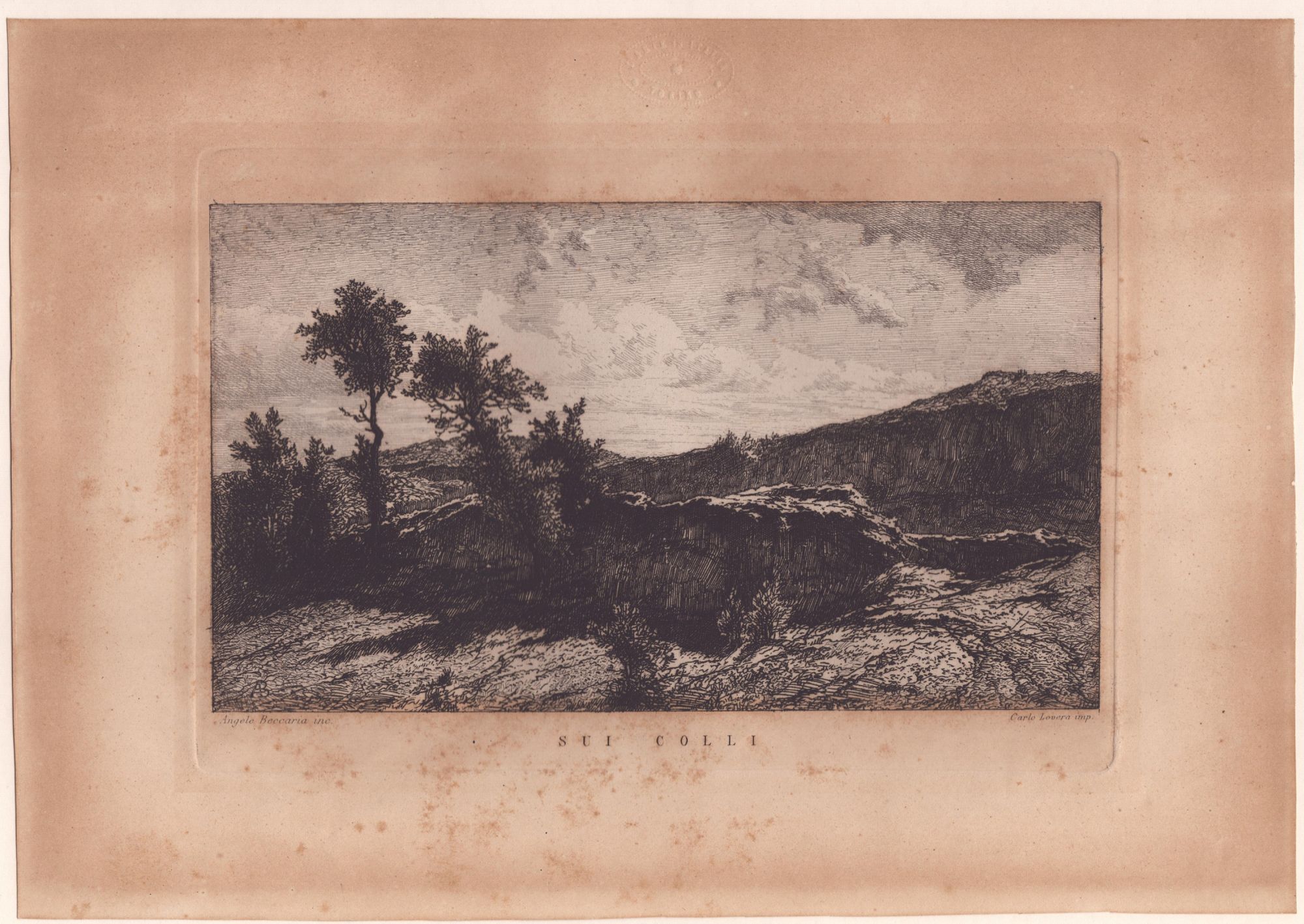Acquaforte, 14,1 x 21 cm (lastra); 20,5 x 29 cm (foglio). Pubblicata da Carlo Lovera (1869-1886 (fl)). Stampata su carta non vergata con timbro a secco. Foglio con uniforme ossidazioni e fioriture. Incollato lungo il bordo superiore su supporto moderno. Con passepartout.