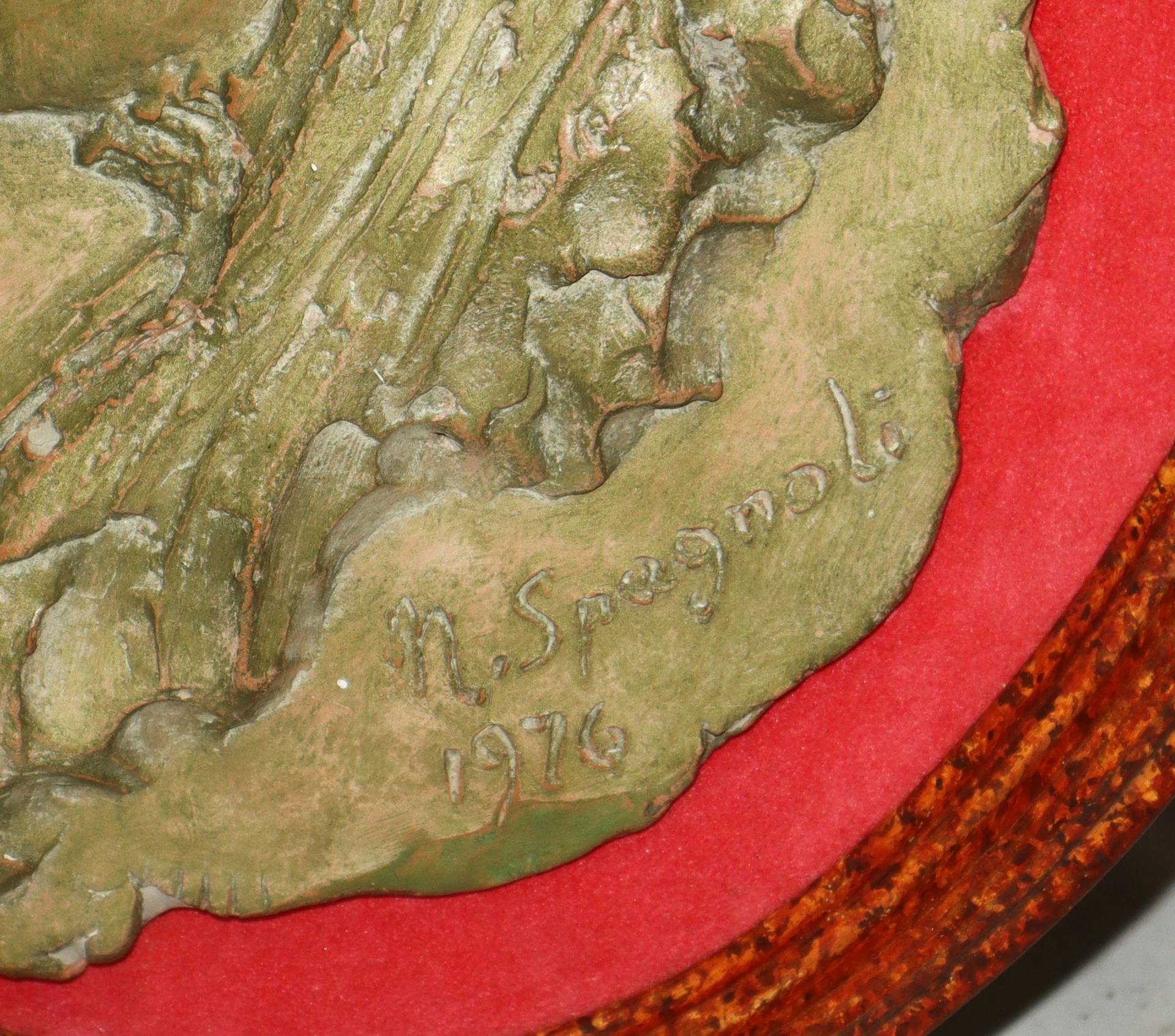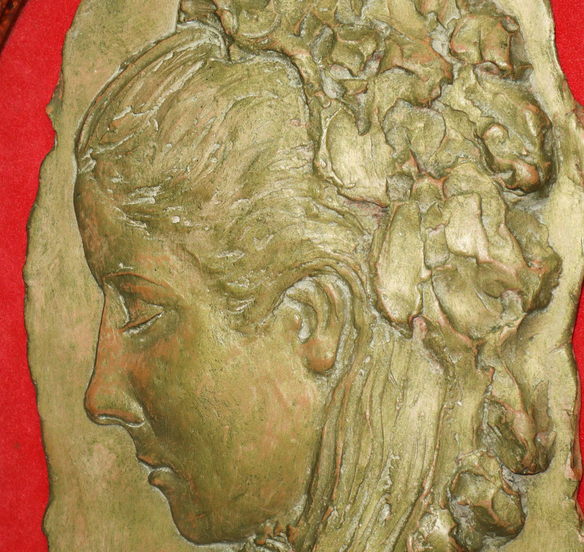 Nino Spagnoli (Trieste 1920-2005) - Scultura in terracotta patinata oro raffigurante volto di donna, 1976 Firmata in basso. In cornice di legno dorataFirmata in basso. In cornice di legno dorata