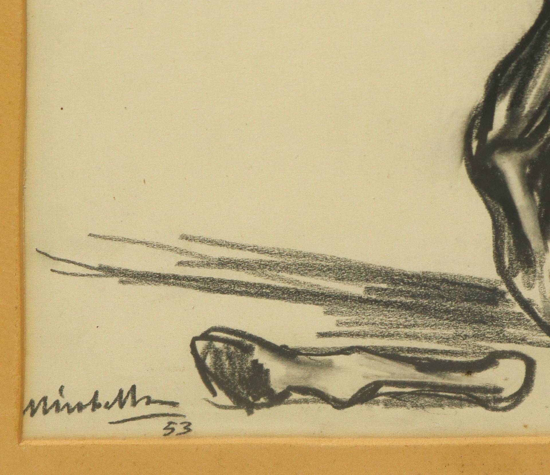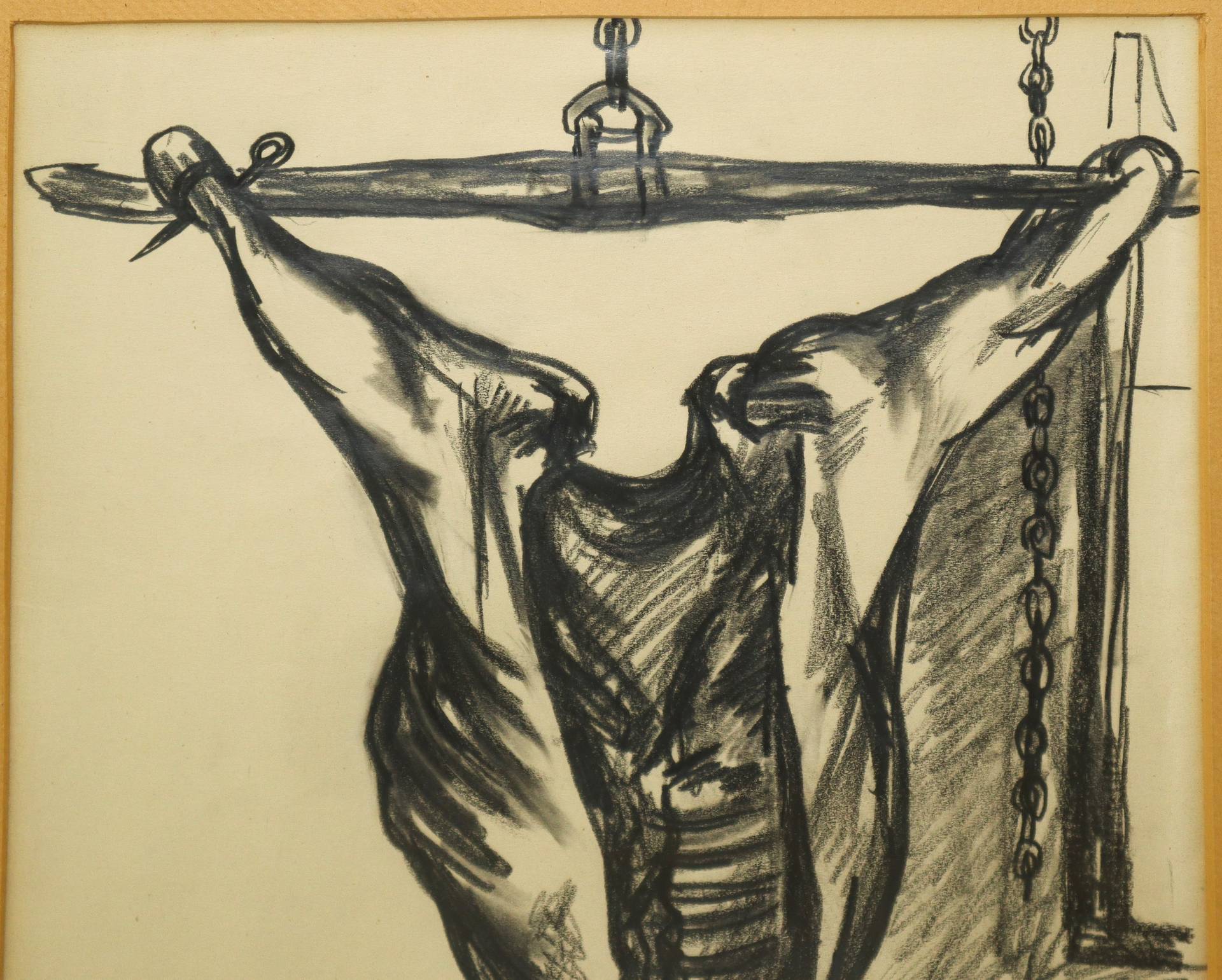 Saro Mirabella (Catania 1914-1972) - Bue squartato, 1953 H cm 47x33 - in cornice H cm 64x50 disegno a carboncino Firmato e datato in basso a destra. Titolo e data al retro.