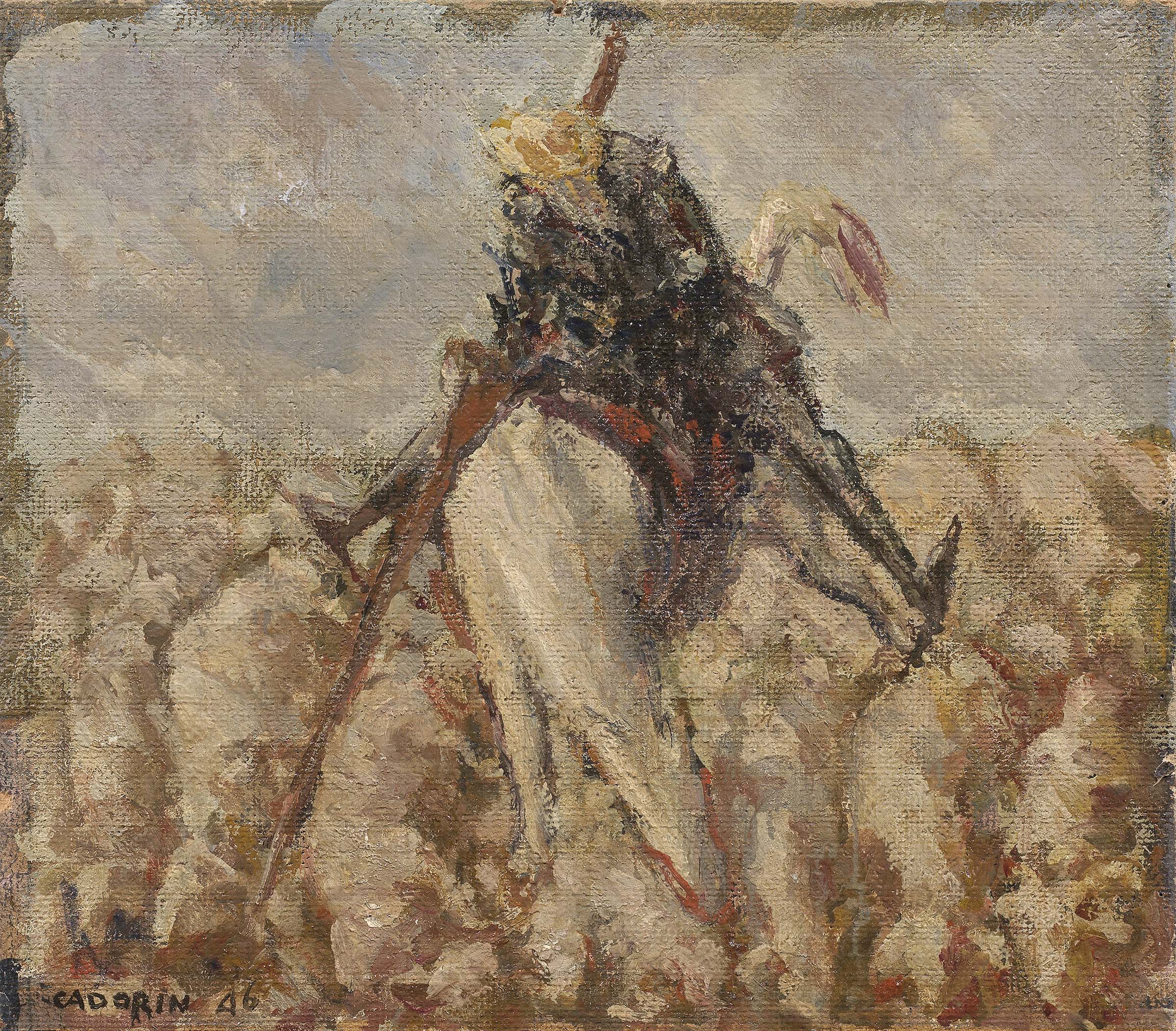 Guido Cadorin Venezia 1892 - 1975 Don Quijote all'assalto di un gregge, 1946 Olio su faesite, cm. 45x49 Firma e data in basso a sinistra: Cadorin 46. Al verso: scritta con dati dell'opera.