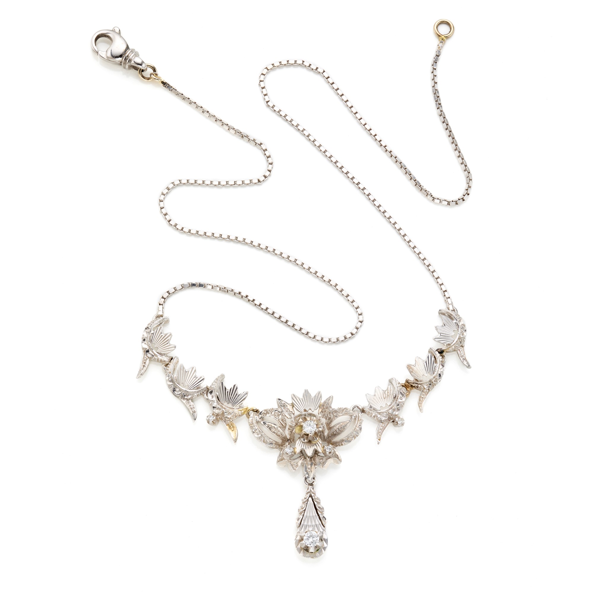 18 Kt white gold necklace with floral festoon centre finished with round diamonds totalling approx. 0,20 ct