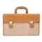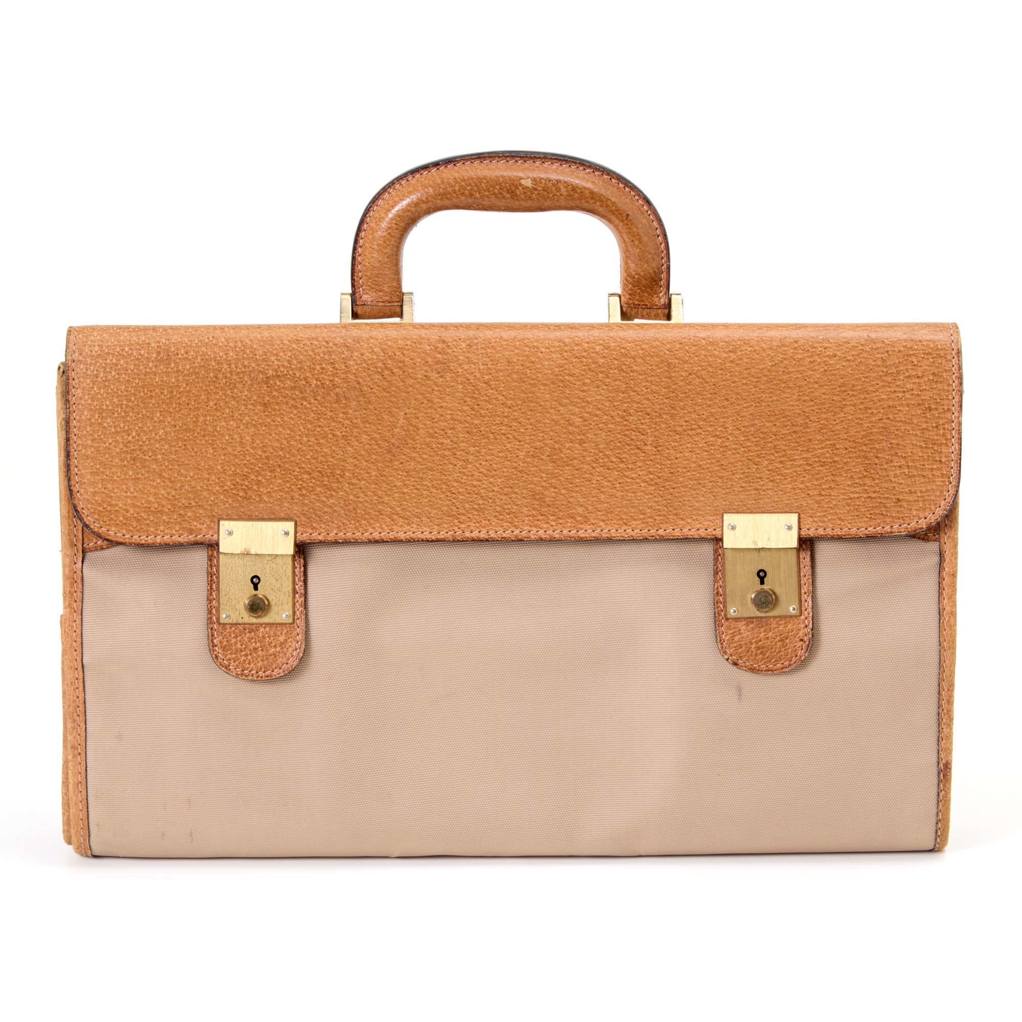 Vintage Gucci briefcase bag in cognac leather and canvas with golden hardware. Tag and padlock included. Fair conditions.