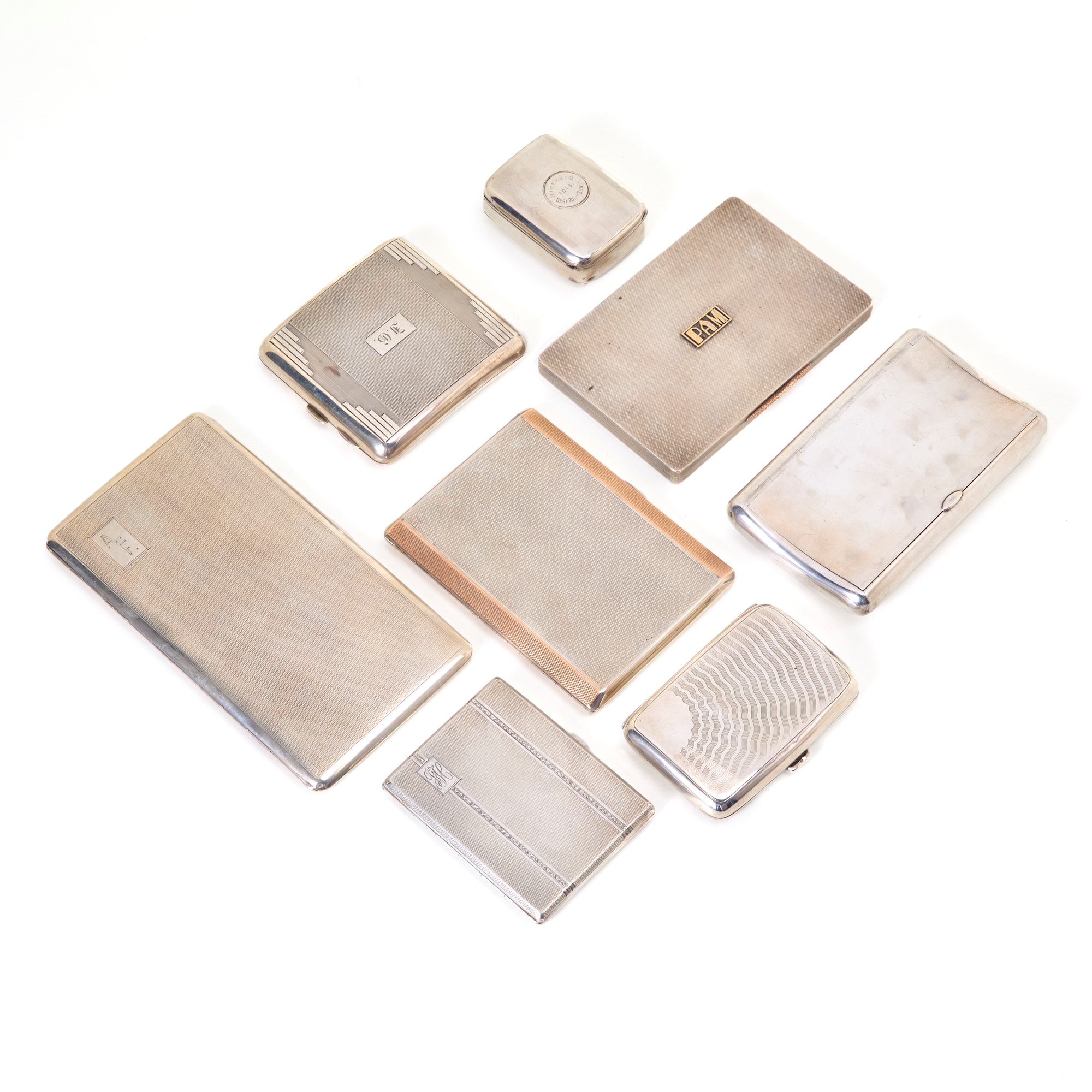 Lotto composto da sette portasigarette e un porta tabacco in argento di diverse dimensioni, punzoni inglesi