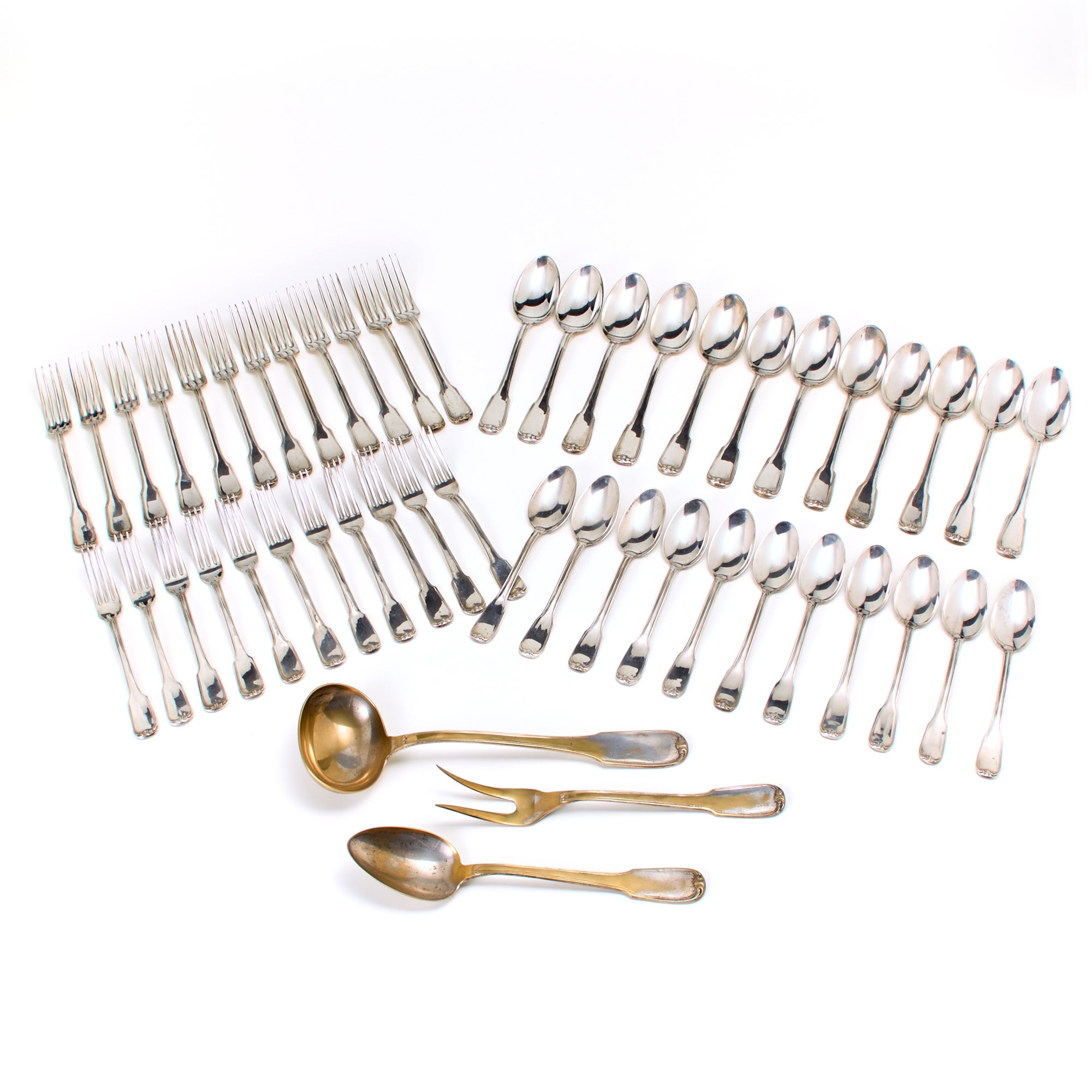 Part of silver-plated metal cutlery set consisting of: twelve spoons, twelve forks, eleven dessert spoons, eleven dessert forks and three pieces of serving cutlery