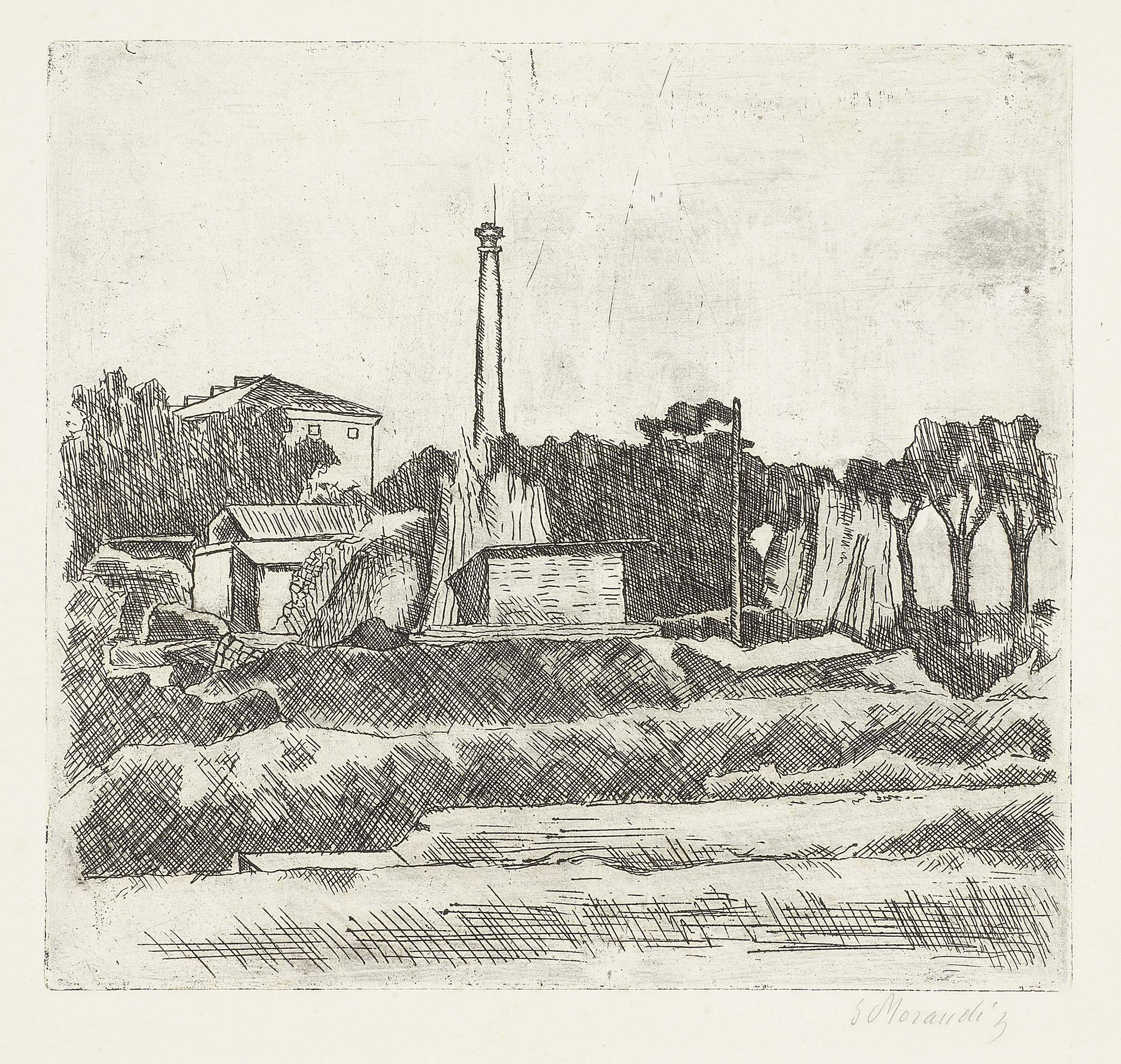 Giorgio Morandi Bologna 1890 - 1964 Paesaggio con la ciminiera (sobborghi di Bologna), 1926 Acquaforte su zinco, cm. 22,7x24,1 (lastra), cm. 32,4x45,5 (carta) Firma in basso a destra: G. Morandi. Primo stato su due, tiratura di alcuni esemplari non numerati. Bibliografia: Lamberto Vitali, L'opera grafica di Giorgio Morandi, Giulio Einaudi Editore, Torino, 1964, n. 27; Michele Cordaro, Morandi incisioni. Catalogo Generale, Edizioni Electa, Milano, 1991, p. 31, n. 1926 1.