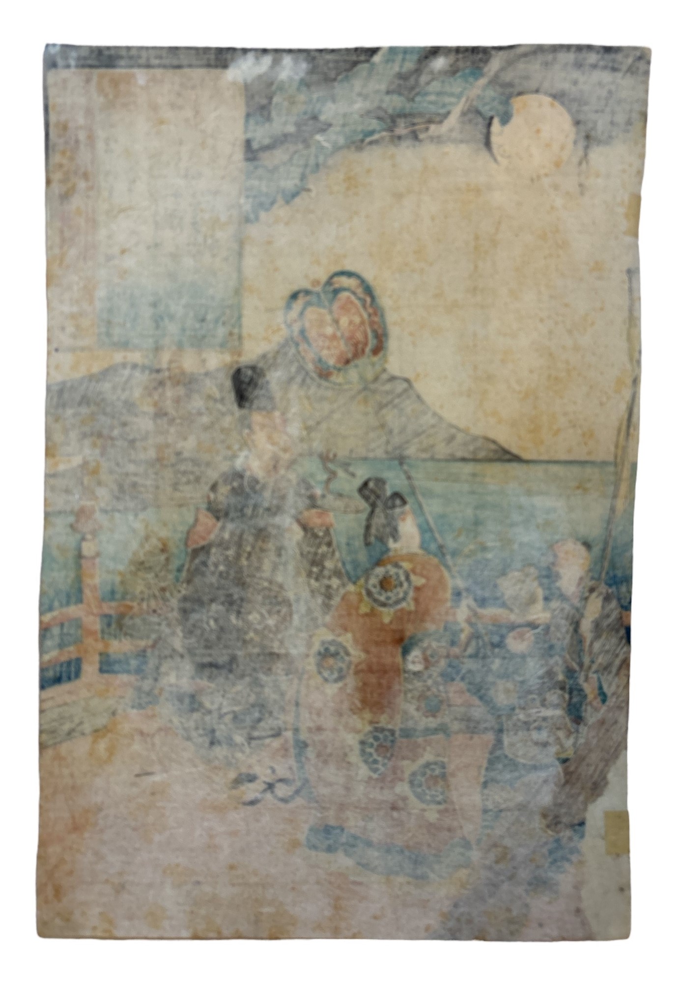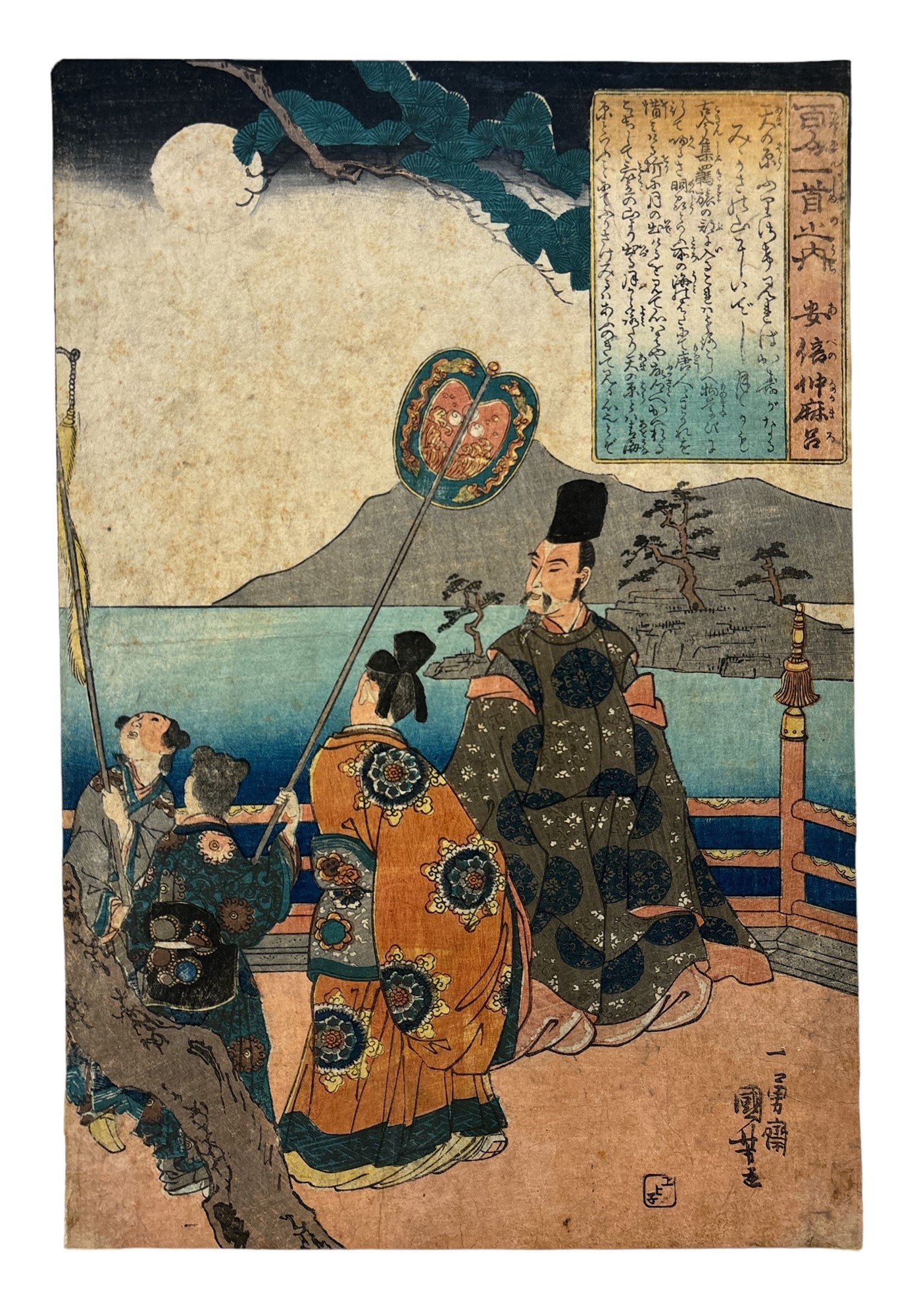 Cent poèmes par Cent poètes, planche Abe-no Nakamaro, Abe-no Nakamaro en Chine sous la pleine lune accompagné d'un dignitaire chinois