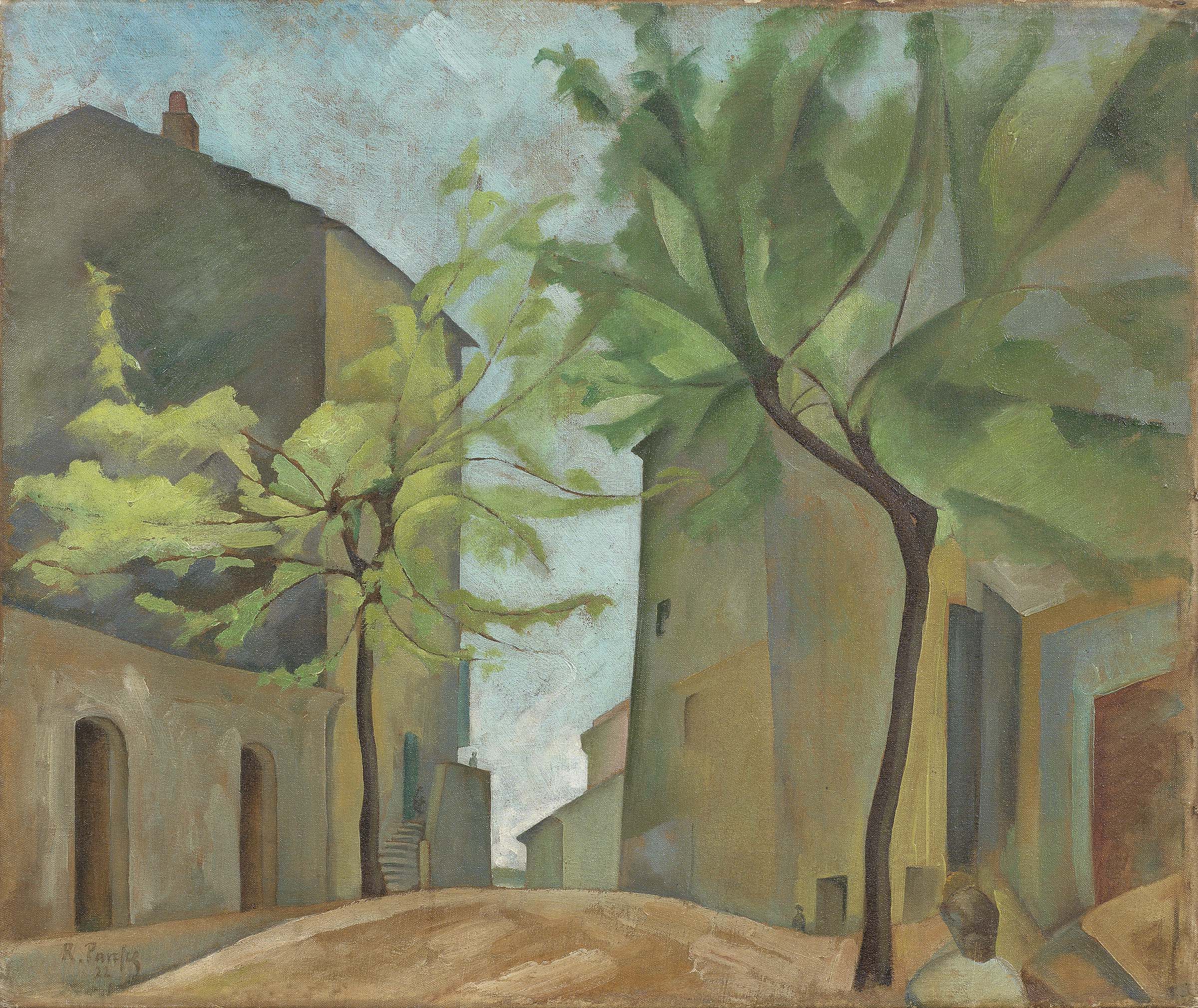 René Paresce Carouge 1886 - Parigi 1937 Paesaggio, 1922 Olio su tela, cm. 54x64,3 Firma e data in basso a sinistra: R. Paresce / 22. Al verso sul telaio: cartiglio 52) Renè Paresce "Paysage 1921" / Peintre italien. Certificato su foto di Rachele Ferrario, in data 5 novembre 2008, opera registrata presso l'Archivio Paresce con n. 12/22. Bibliografia: Rachele Ferrario, René Paresce. Catalogo ragionato delle opere, Skira editore, Milano, 2012, pp. 179, 172, n. 12/22.