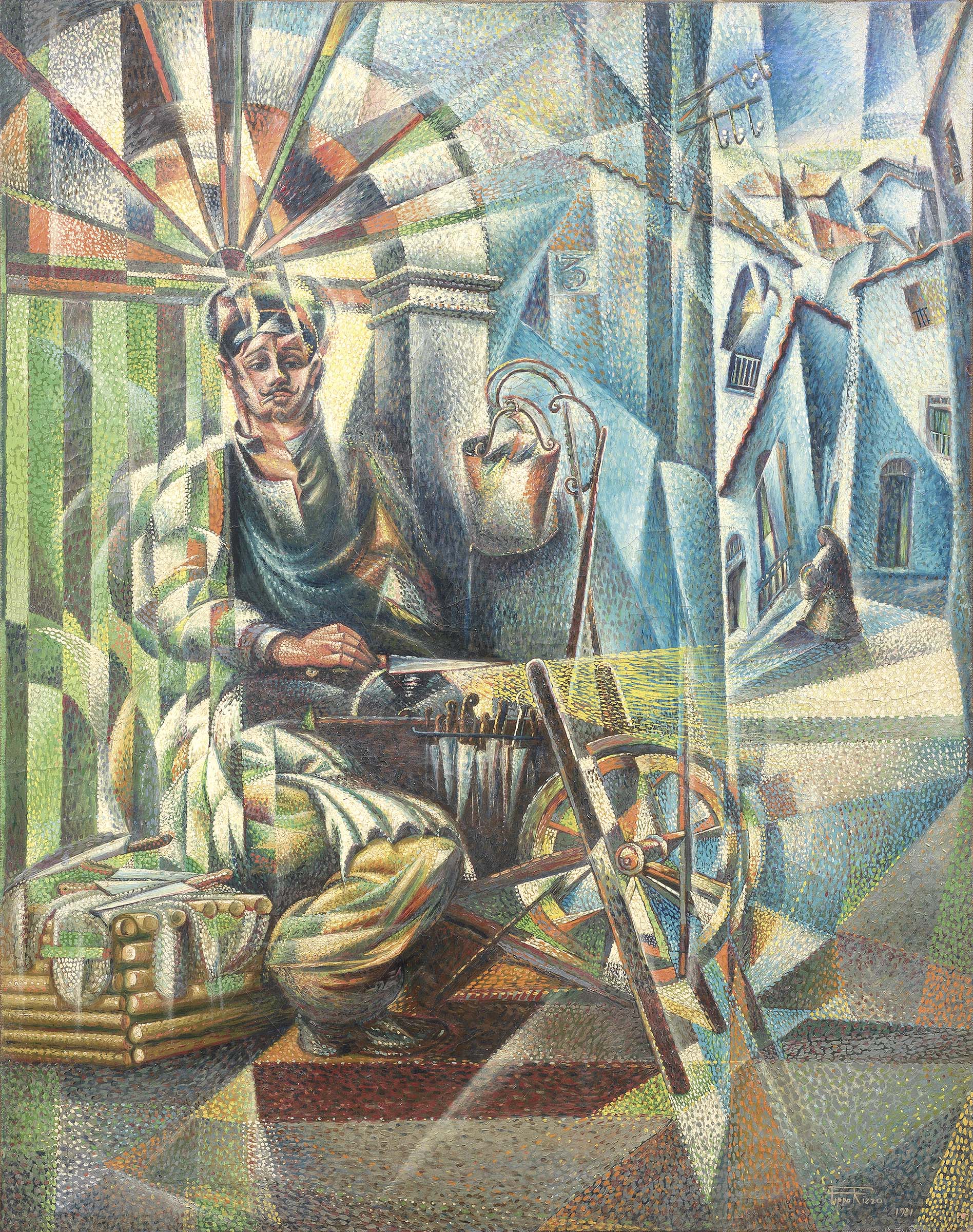 Pippo Rizzo Corleone (Pa) 1897 - Palermo 1961 L'arrotino, 1921 Olio su tela, cm. 118,5x94 Firma e data in basso a destra: Pippo Rizzo / 1921. Al verso sul telaio: etichetta Micro / Movimento Internazionale Culturale Roma / Futurismocentoanni 1902-2009 / Continuità del Futurismo. Sud-Nord / Roma, 20 febbraio / 20 marzo 2009. Storia: Collezione privata, Roma; Collezione privata Certificato su foto Archivio storico dei futuristi siciliani, a cura della Diomedea Arte, Palermo. Esposizioni: Futurism, a cura di Maurizio Scudiero, Taipei, National Chiang Kai-Shek Memorial Hall, 2009, cat. p. 221, illustrato a colori; Dal Futurismo al Najs passando per la Pop Art, a cura di Maurizio Scudiero, Taormina, Chiesa di San Francesco di Paola, 24 agosto - 10 settembre 2012, cat. p. n.n., illustrato a colori; Dal Futurismo ai percorsi contemporanei, a cura di Maurizio Scudiero, Montenegro, 5 luglio - 15 agosto 2013, cat. p. n.n., illustrato a colori. Bibliografia: Anna Maria Ruta, Pippo Rizzo. Un nomade nell'arte del Novecento siciliano. A Wanderer, Eidos, Palermo, 2008, pp. 38, 366, n. 31.