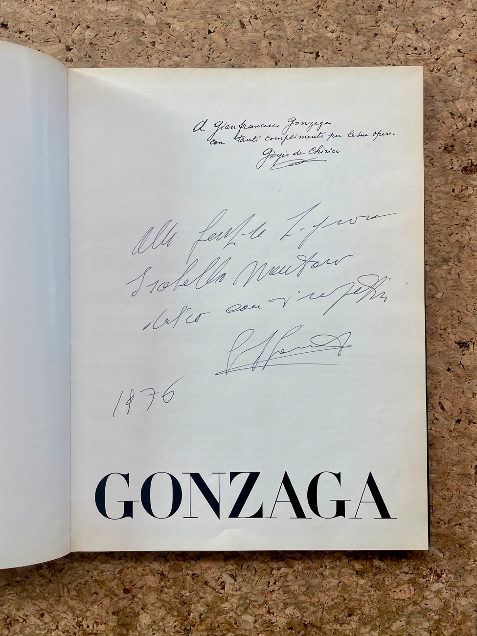 Reca doppia dedica firmata e datata dagli Artisti Giovanfrancesco Gonzaga e Giorgio De Chirico all'interno