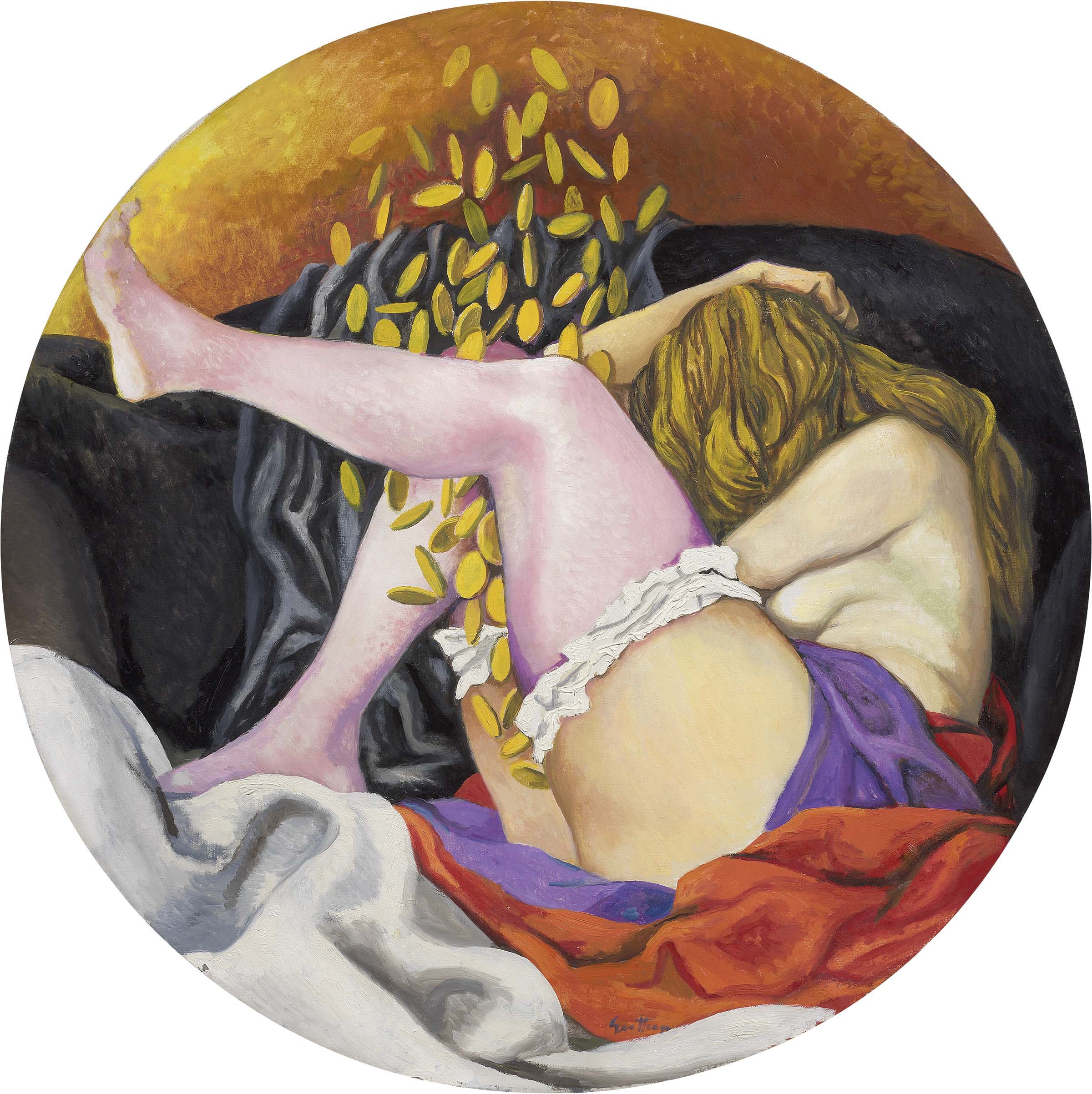 Renato Guttuso Bagheria (Pa) 1912 - Roma 1987 Danae Olio su tela, cm. 99,5 ø Firma in basso al centro: Guttuso. Storia: Collezione Enrico Coveri, Firenze; Collezione privata Bibliografia: Renato Guttuso, Cartoline, Lettere, Milano, 1986, p. 4.