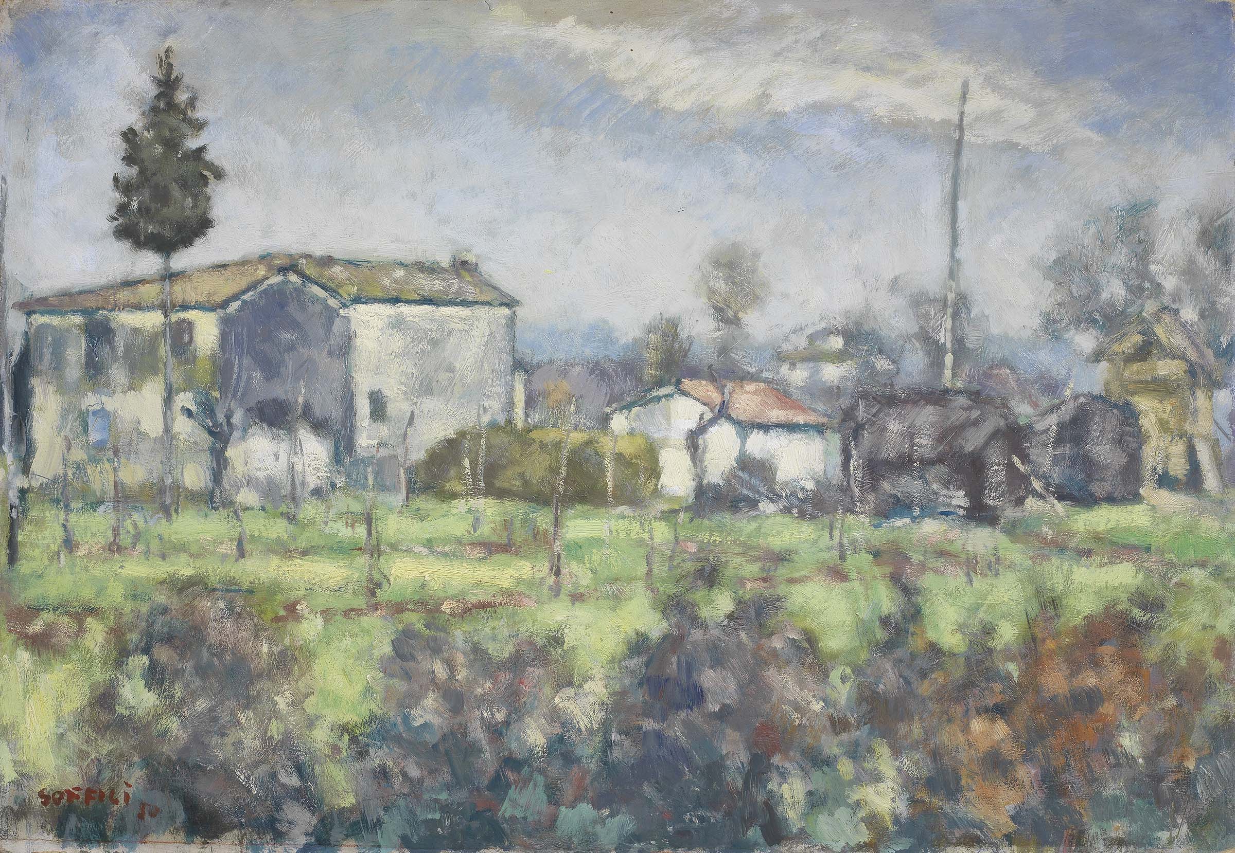 Ardengo Soffici Rignano sull'Arno (Fi) 1879 - Vittoria Apuana (Lu) 1964 Casa del Berna, 1950 Olio su cartone, cm. 51x74,5 Firma e data in basso a sinistra: Soffici / 50. Al verso: etichetta Esposizione / Soffici / Milano 1952. Certificato su foto di Luigi Cavallo, Milano, 8 gennaio 2000. Esposizioni: Soffici alla Galleria San Fedele, Milano, Galleria San Fedele, 23 gennaio - 15 febbraio 1952, cat. n. 22; Ardengo Soffici, giornate di pittura, a cura di Luigi Cavallo, Bologna, Galleria Marescalchi, ottobre 1987, cat. p. 182, n. 94, illustrato.