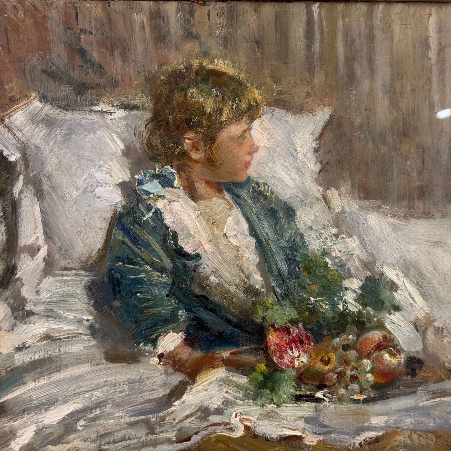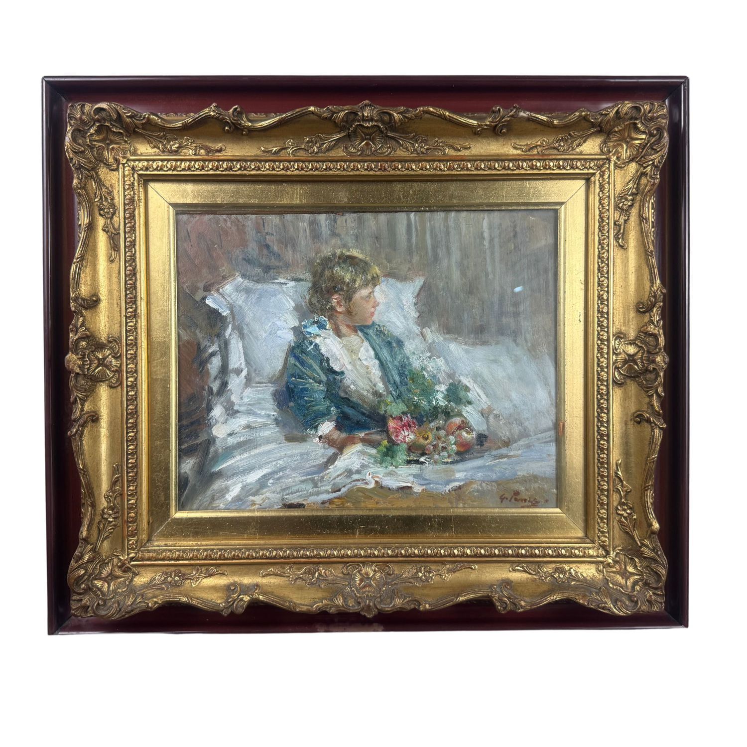 Dipinto olio su tavoletta, periodo XX secolo, raffigurante Bambino a letto con fiori.