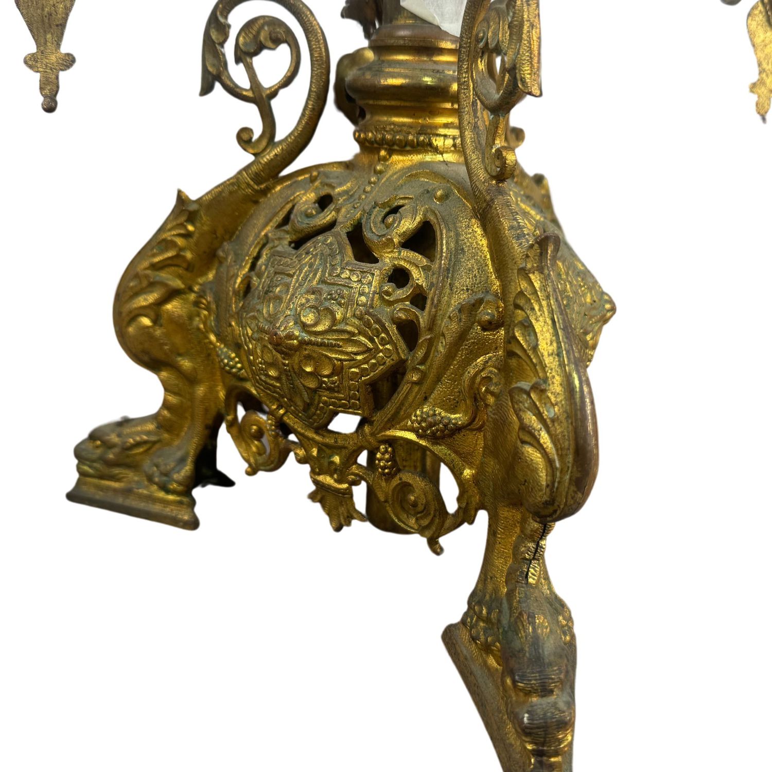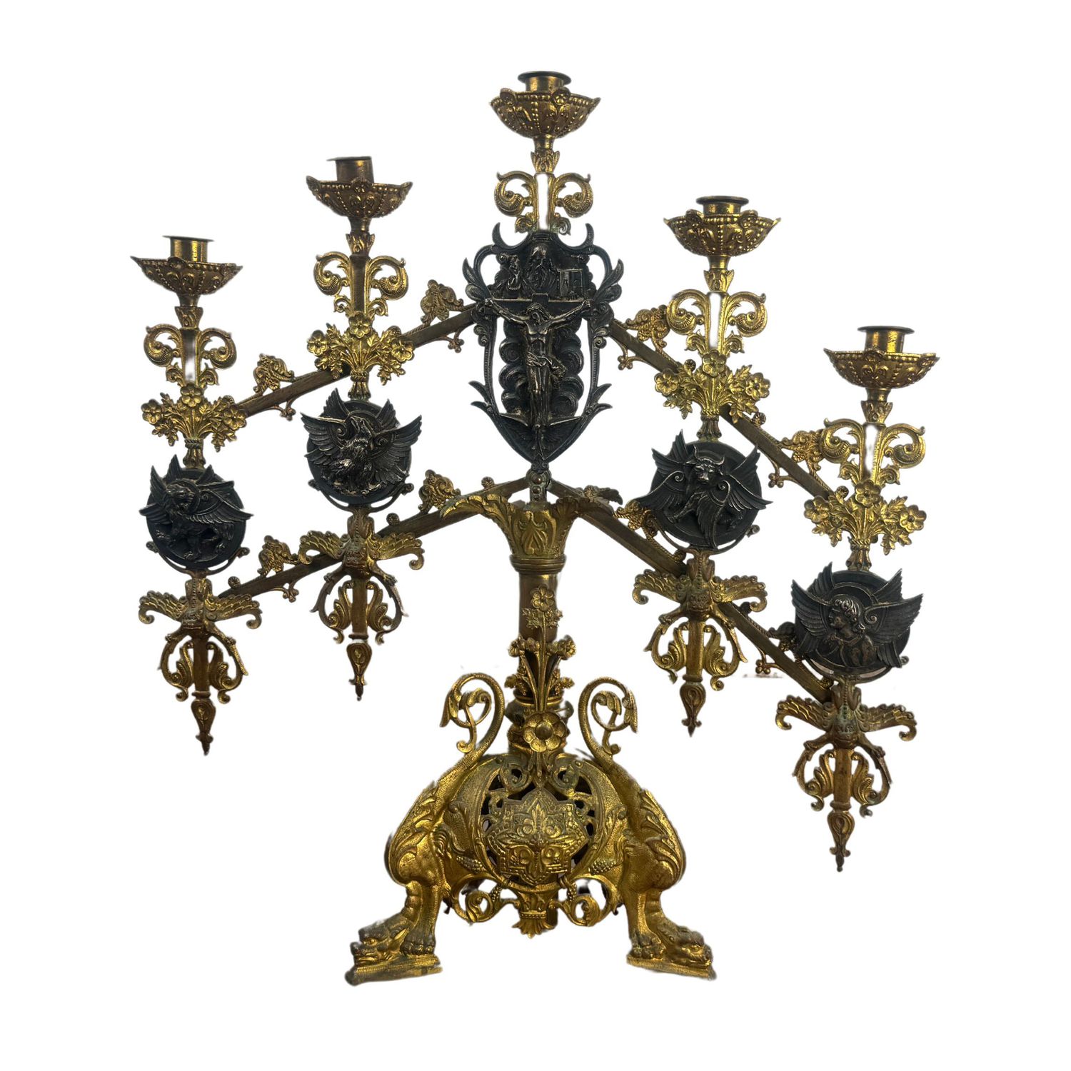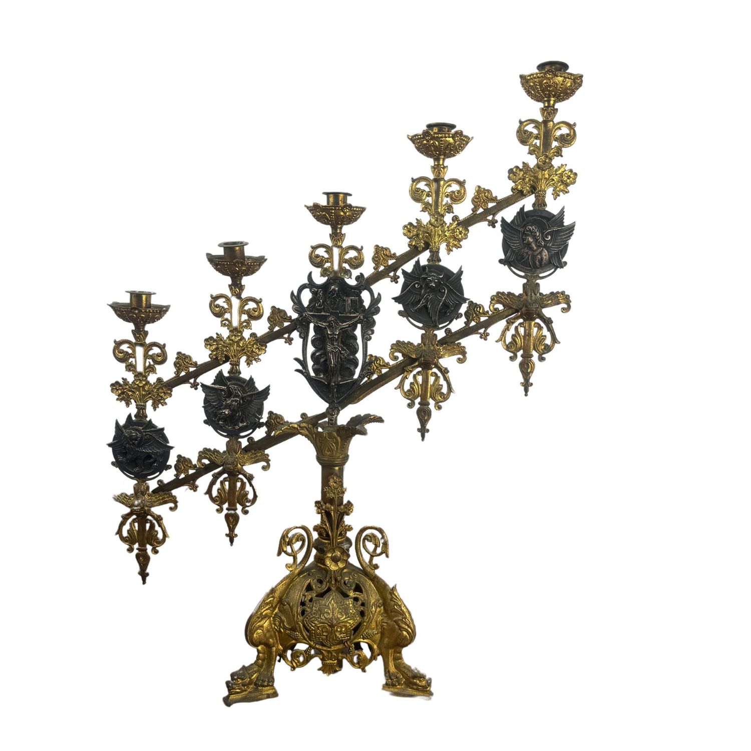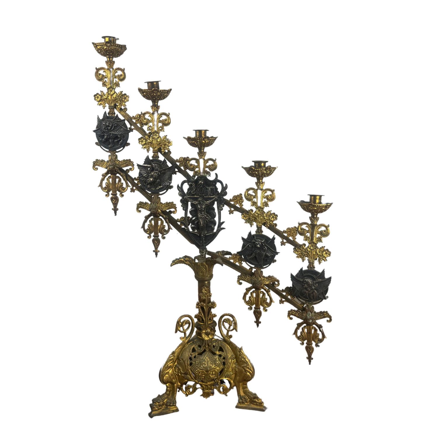 Candelabro in bronzo dorato finemente cisellato, cinque portacandele, braccia basculanti, corpo centrale regolabile in altezza.