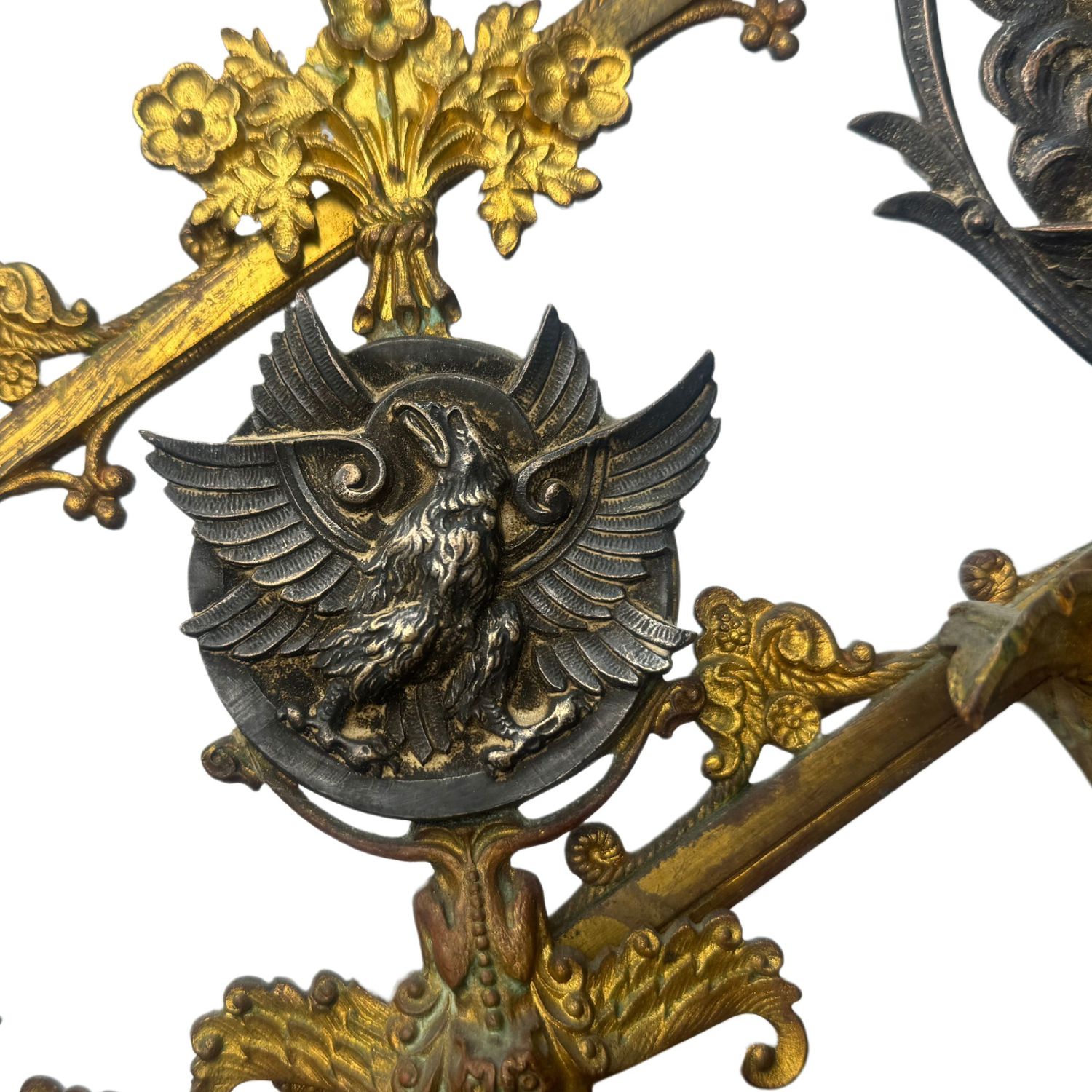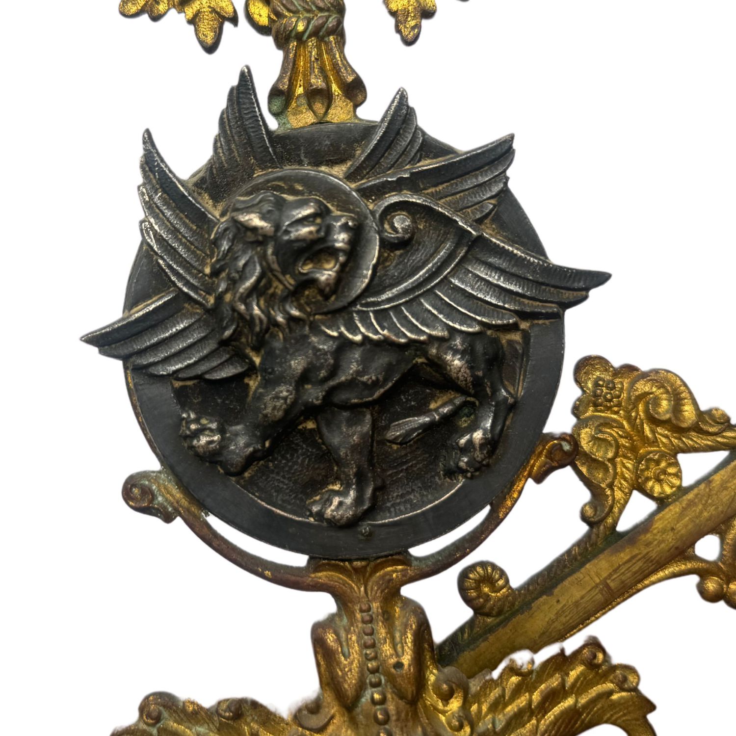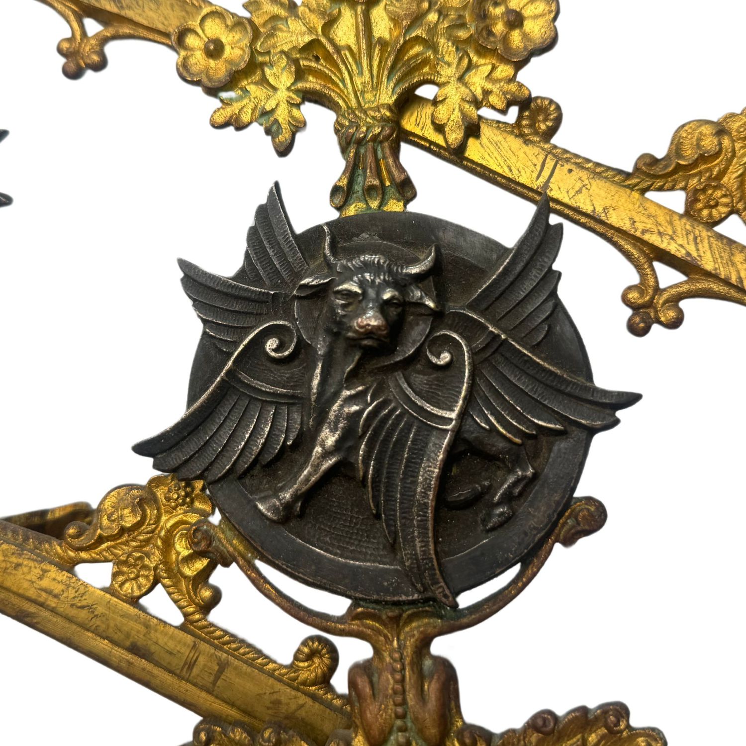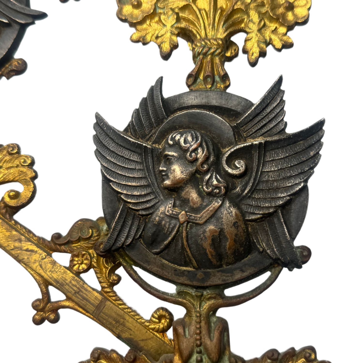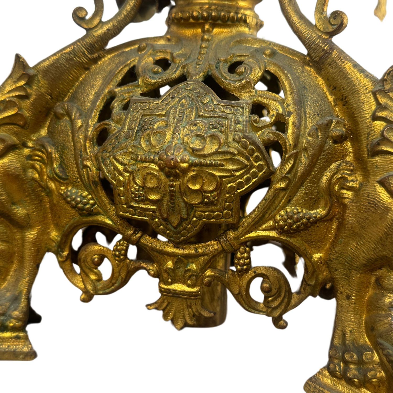 Candelabro in bronzo dorato finemente cisellato, cinque portacandele, braccia basculanti, corpo centrale regolabile in altezza.