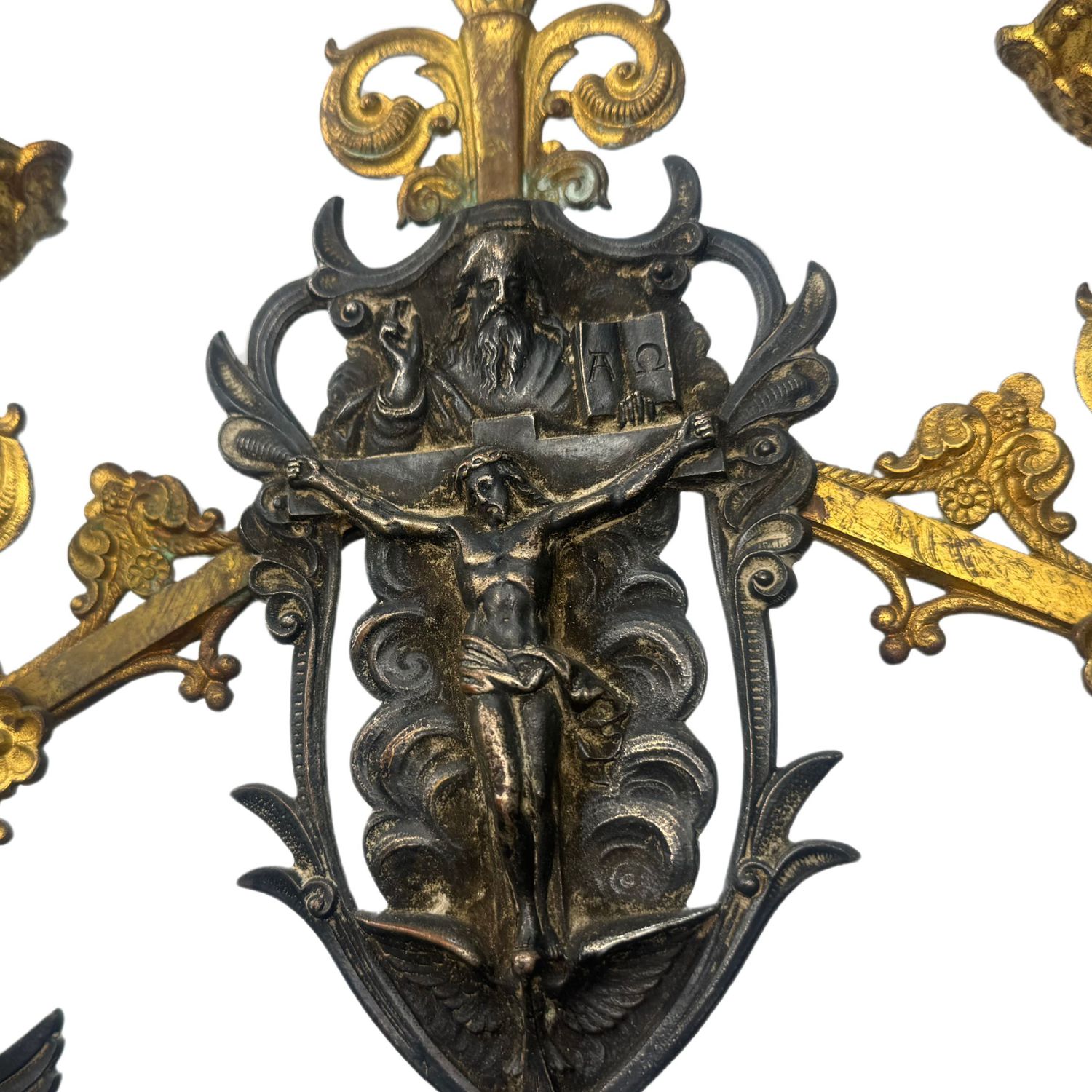 Candelabro in bronzo dorato finemente cisellato, cinque portacandele, braccia...