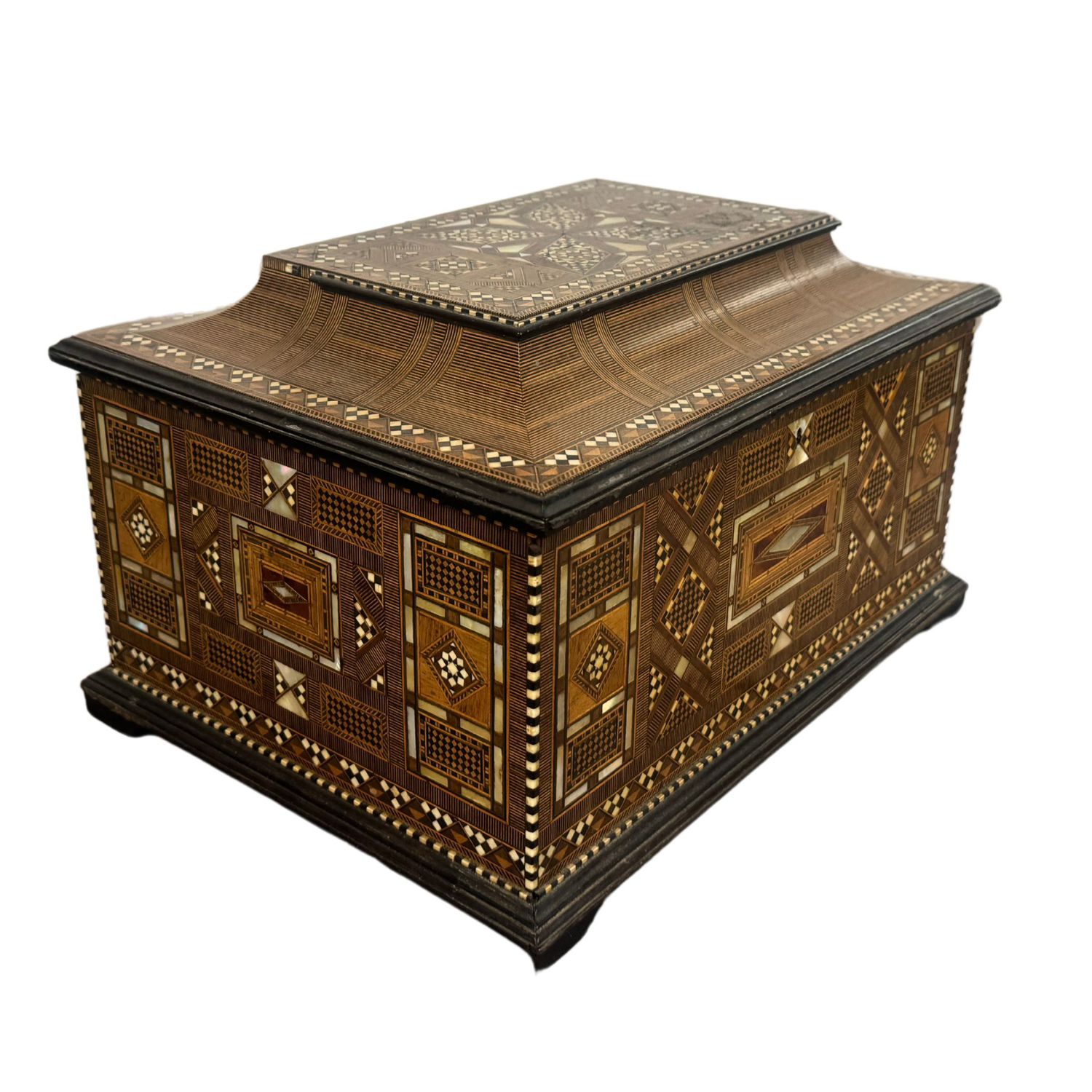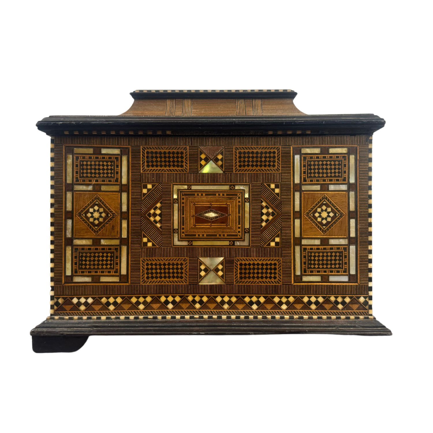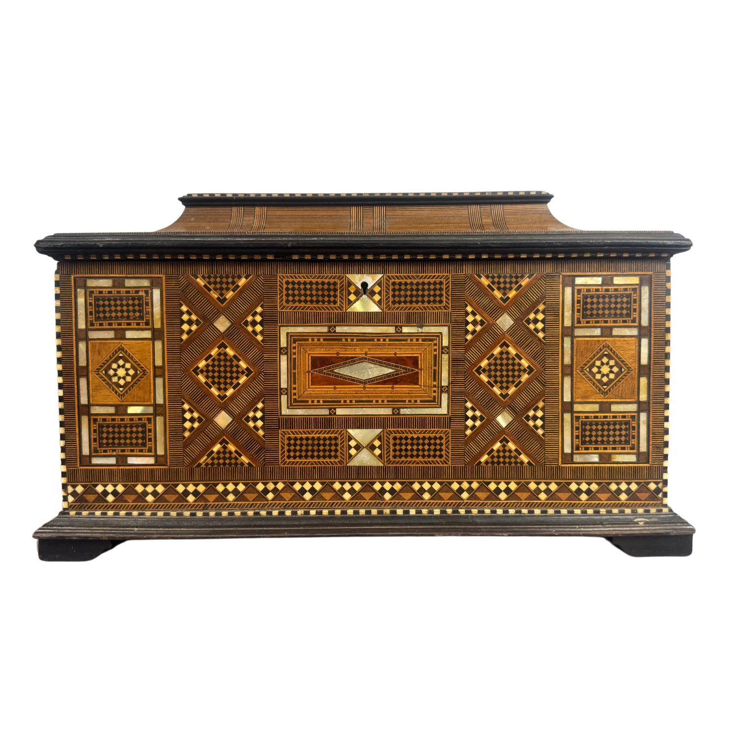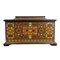 Cofanetto interamente intarsiato con vari tipi di legni, periodo XIX secolo.
